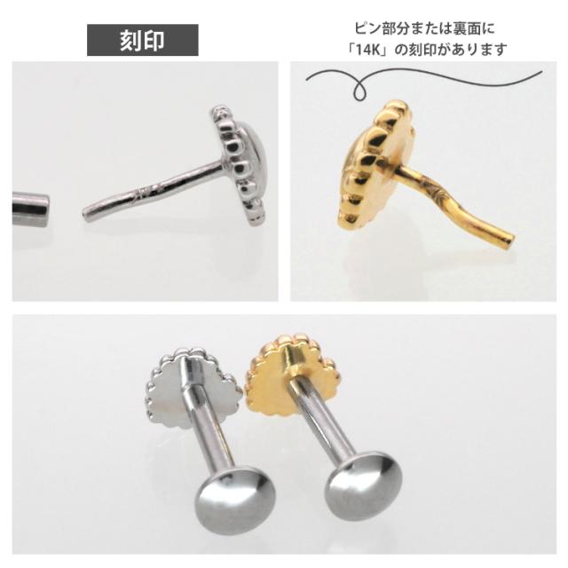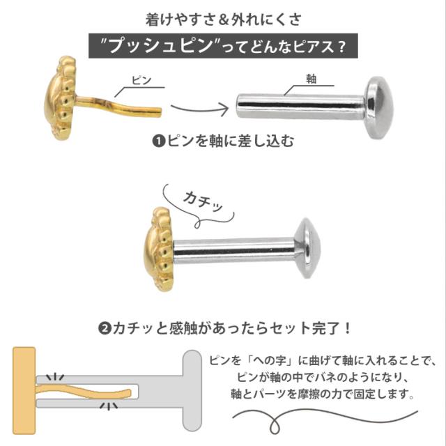 人気のプッシュピンが贅沢で上品な14金製で登場。 トラガスのような狭い部位や、ネジタイプが苦手な方には特にお勧めです。 シンプルながらも14金の輝きを味わえるうれしいアクセサリーです。 ヘッド部分から伸びるピンを軸に差し込めば装着完了です。ネジが無いので、知らない間に緩んできて失くしてしまった、そんな悩みからも開放されます。