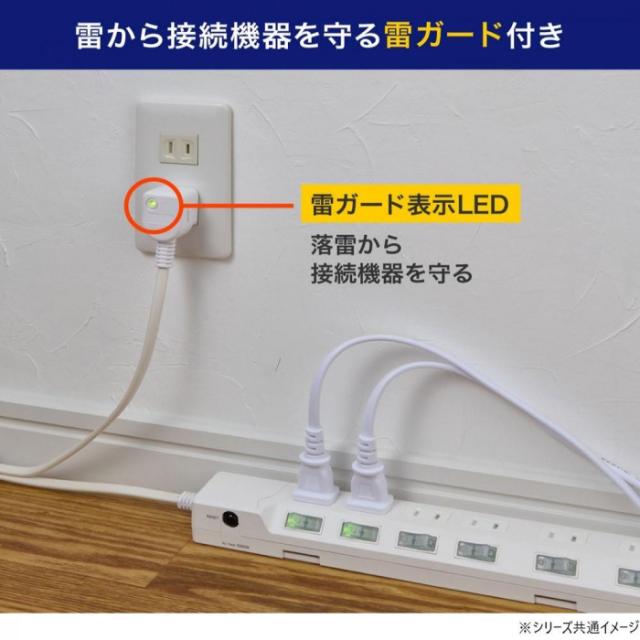 商品詳細:LEDランプ仕様。独立スイッチ。雷から接続機器を守る耐雷サージ付。過電流を防止するブレーカー内臓。プラグに雷ガード表示LED付。AC差込口はホコリ・ゴミの侵入を防ぐ扉付。熱や衝撃に強いPBT樹脂採用。コードは、断線に強い保護被ふく。ACアダプター用差込口。本体の向きによって、差込口向きが選べる。 生産国:ベトナム 仕様:定格:AC125V 15A合計 1500Wまで使用温度範囲:-10度~40度コード長:5m口数:6個口屋内専用国内専用