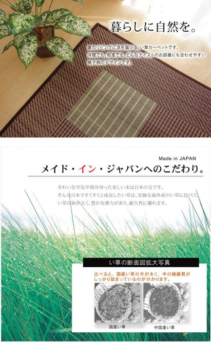 | シンプルで飽きのこない格子柄のい草カーペットです。国産(九州産)のい草を使用しています。一本一本が太く、表皮が厚く繊維がキメ細かいので弾力性があり、耐久性に優れています。 ■い草には空気の自然浄化作用、湿度の調節作用などがあります。また汚れにくく、使用するうちに黄金色に変化し味が出ます。 ■裏にはウレタンを貼っていますのでフローリングでのご使用にも適しています。 |
