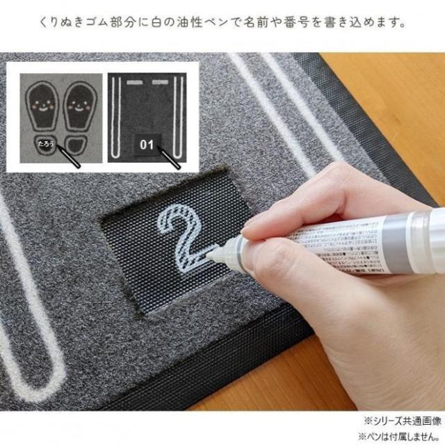 商品詳細:お子様の靴揃え教育にぴったり!自分の置き場を決めることで、靴を揃えたくなるマットです。くりぬきゴム部分に白の油性ペンで名前や番号を書き込めます。 生産国:中国 素材・材質:表地:ナイロン100%裏地:ゴム 商品サイズ:約30×65cm