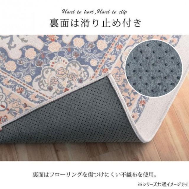 商品詳細:シェニール織りは、18世紀末に英国で生まれ、ドイツで人気が出た両面パイルの織物です。上品な風合いのジャカード織りで、ペルシャ絨毯のようなメダリオン柄を表現。デザイン性が高く、耐久性にも優れています。さらっとした肌触りで、季節を問わず一年中お使いいただけます。裏面にはフローリングを傷つけにくい不織布張り。ホットカーペット、床暖房対応。毛足が短いためお掃除もカンタン。 生産国:中国 素材・材質:表地:ポリエステル100%(シェニールジャガード)裏地:不織布 商品サイズ:約130×185cm 仕様:手洗い可裏地:滑り止め付き