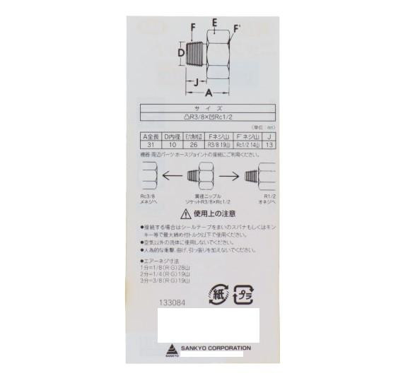 商品詳細:各種機器・周辺パーツ・ホースジョイントの接続にお使いください。 生産国:中国 素材・材質:真鍮 仕様:本体ネジサイズ:凸R3/8(テーパーネジ)×凹Rc1/2(テーパーネジ)最高使用圧力:1.4MPa(14kgf/cm2)適用流体:空気推奨締付トルク:15N・m温度範囲:ー20度~60度