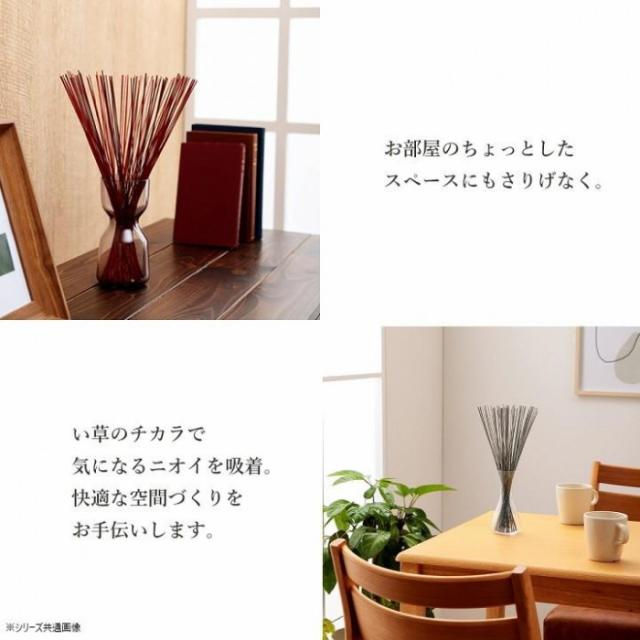 | い草には空気の自然浄化作用、湿度の調節作用、リラックス効果などがあります。お好みの長さにカットできるので、ご自宅の玄関やリビング、トイレだけでなく、車内やオフィスなど様々なシーンでご使用頂けます。 【ご使用上の注意】 ・自然素材ですので、い草の太さにより、スティックの本数が違う事があります。 ・い草スティックは、染色しておりますので触ると色が付着します。手に付いた場合は、石けんでよく洗ってください。 ・い草は常に空気中の水分の吸放出をしています。多湿の状態が続くとい草は過剰に水分を吸収し、カビの発生を招きます。 ・できるだけ風通しの良いお部屋でご使用ください。 ・照明及び日光により変色(日焼け)する可能性があります。 ※掲載写真は表記サイズと異なる場合がございます。 ※画面上のカラーはご使用ブラウザやモニターの設定により、実物とは若干異なる場合がございます。 |