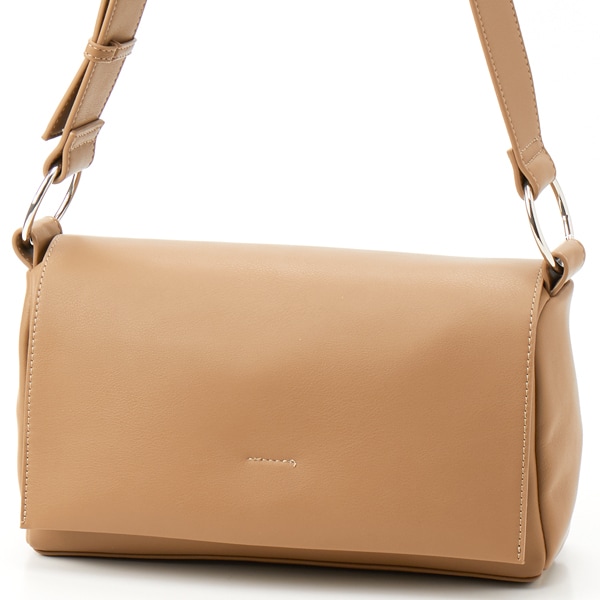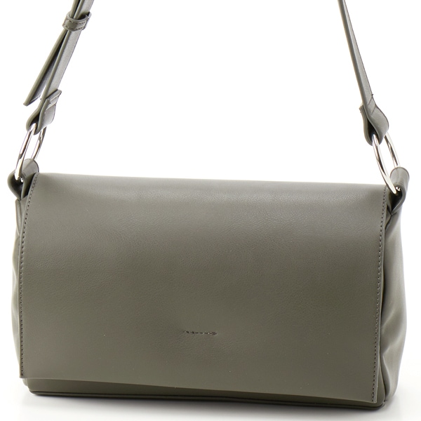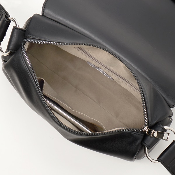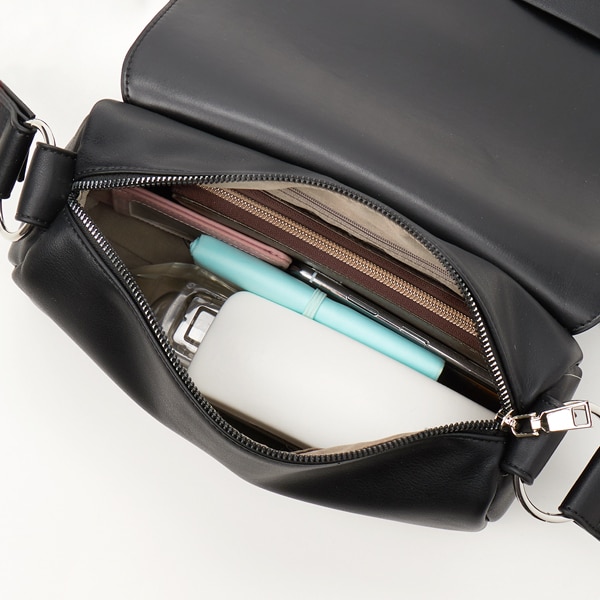 シンプルなデザインのフラップショルダーバッグ。