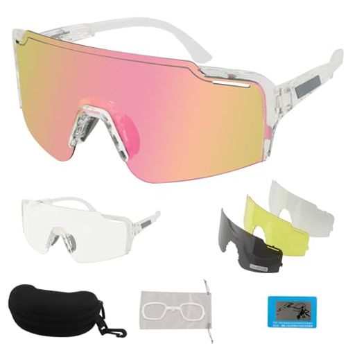 [FOCUHUNTER] 偏光サングラス スポーツサングラス 交換レンズ4枚‐(偏光レンズ、イエローレンズ、クリアレンズ、ピンクミラーレンズ) クリアハーフフレーム サイクリンググラス レディース…