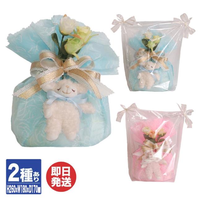 | セット内容 | ・マスコット×1 ・ティッシュフラップ×1 ・造花×1 ・おしりふき80枚入り×2 ・パンパースS(テープ)×3 ※PPラッピング、リボン付き |