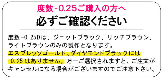 | 度数(D) | 0.00〜-6.00(0.25ステップ)※ -6.50〜-8.00(0.50ステップ) ※-0.25Dはジェットブラック、リッチブラウン、ライトブラウンのみ | |