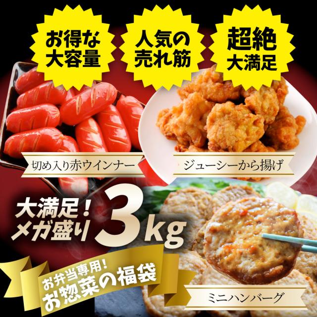 お弁当 お惣菜福袋 メガ盛り 3種 3kg 大容量 売れ筋 大満足 そうざい お惣菜 冷凍 セット 唐揚げ ハンバーグ ウインナー 肉 ギフト プレゼント 食べ物 食品 誕生日 プレゼント あす楽 通販 グルメ 誕生日