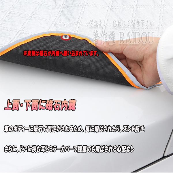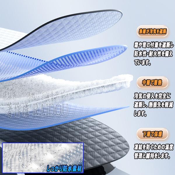 カバーは4層の異なる厚手素材で作られており、耐久性だけでなく、防水や断熱にも優れているため、日焼けによる内装劣化や、積雪や凍結から愛車をしっかり保護できます。