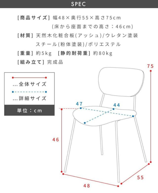 | サイズ | 幅48×奥行55×高さ75cm 座面までの高さ:46cm 重量:約5kg |