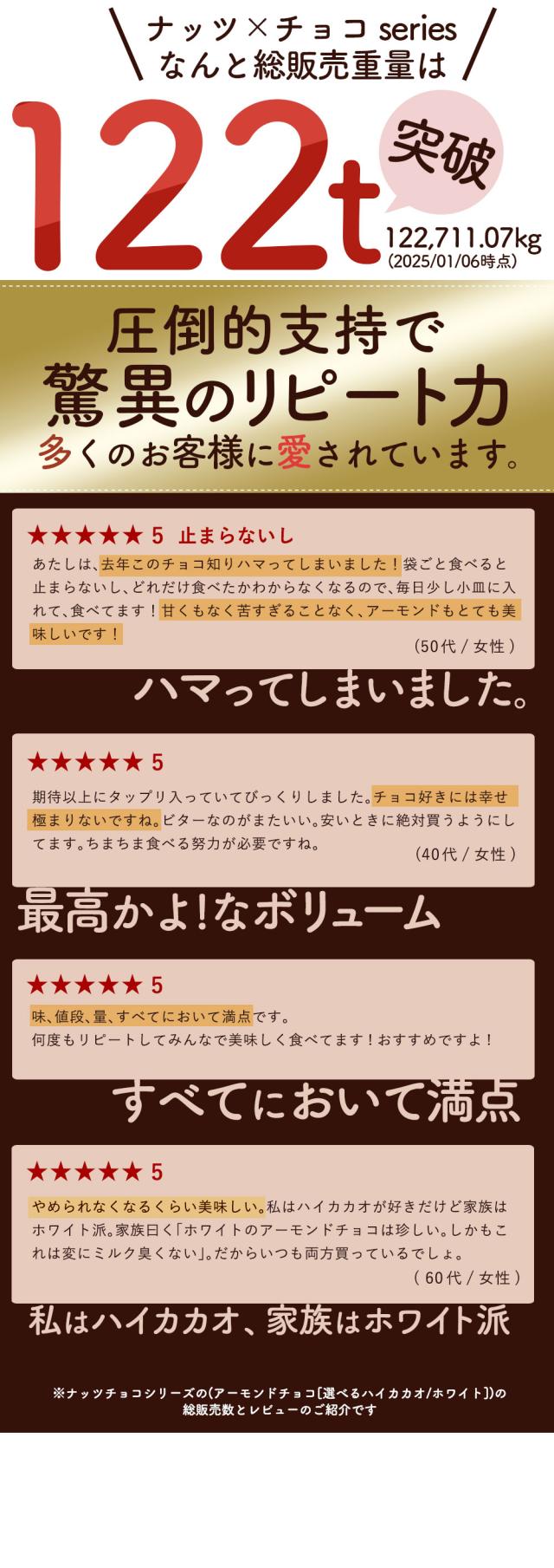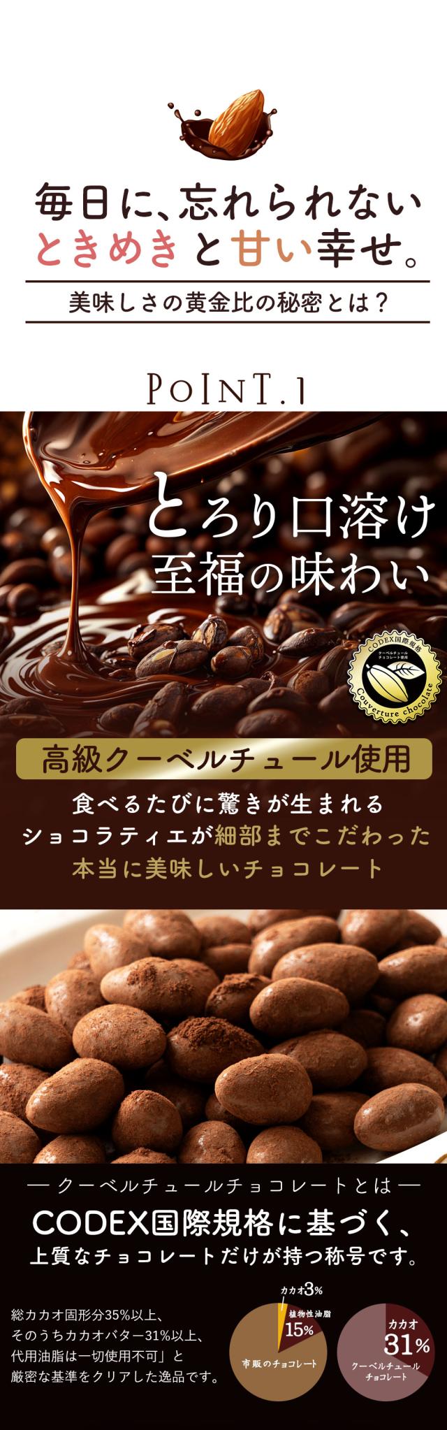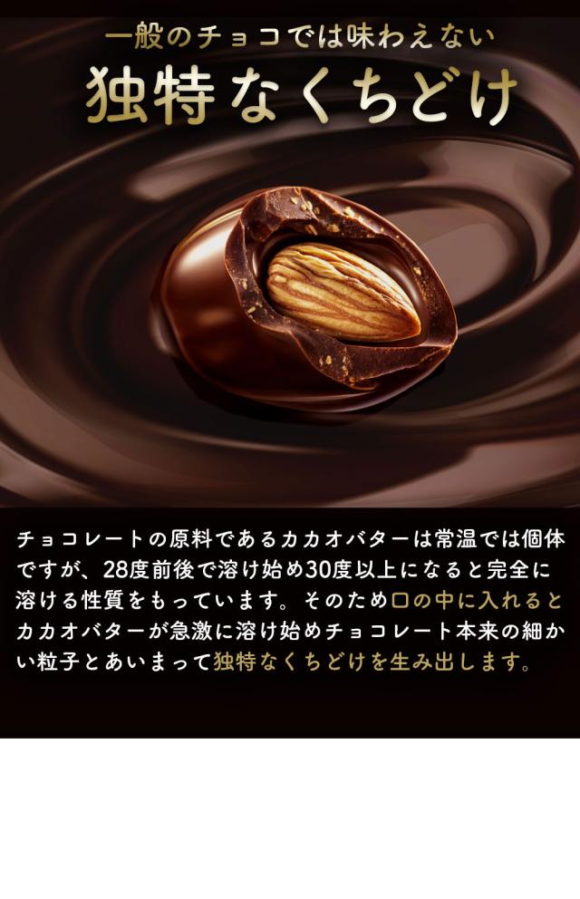 アーモンド(アメリカ)、砂糖、ココアバター、全粉乳、カカオマス、ココアパウダー/乳化剤、香料、(一部にアーモンド・乳成分・大豆を含む)