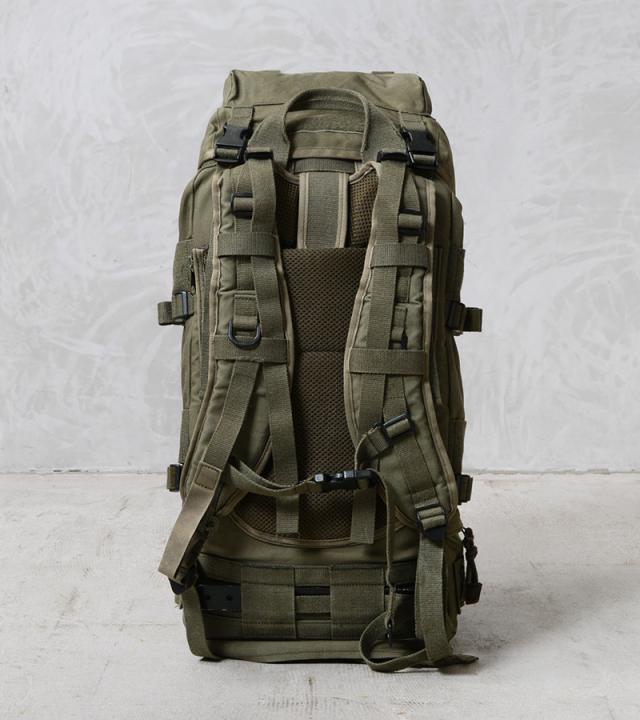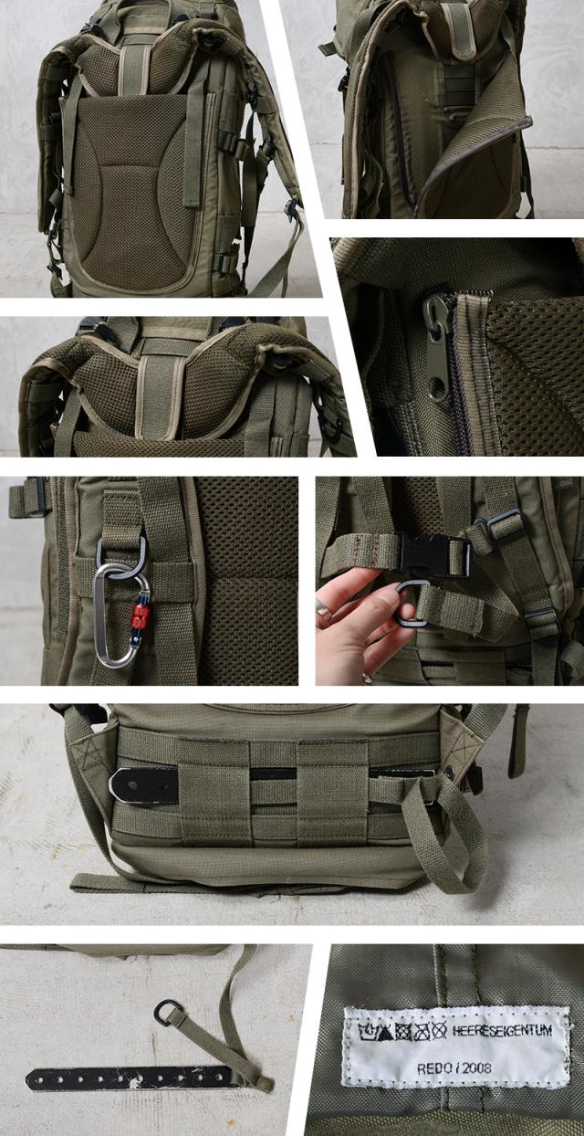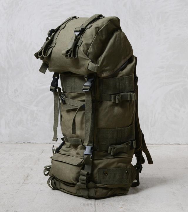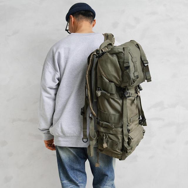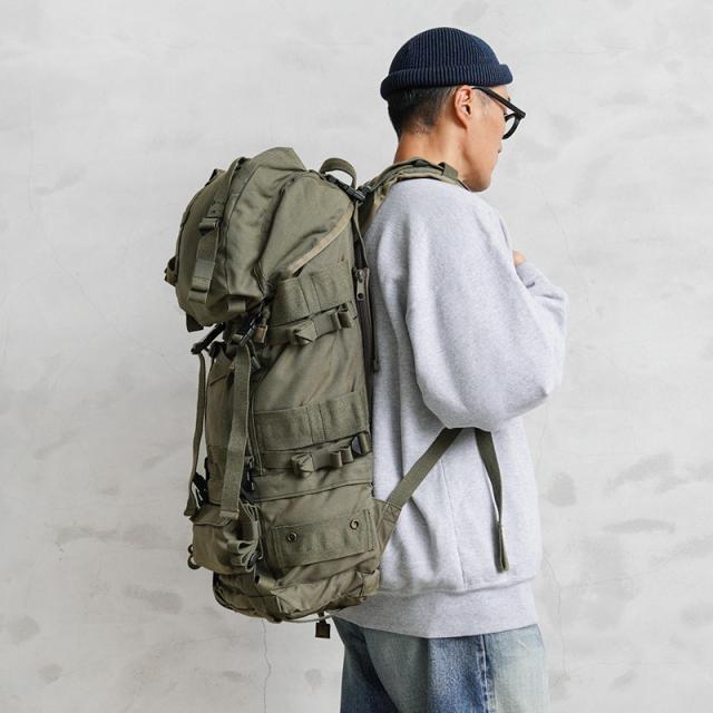 オーストリア軍の戦闘装備とシームレスに統合できるように設計された軍用バックパック。 長時間の歩行を伴う山岳地帯などでの活動に使われていた大容量設計になっています。軽量かつ丈夫な裏側に防水コーティングを施したナイロン素材で、珍しい細身の形状。人間工学に基づいて設計され、肩にかかる負担を軽減する金属の内部フレームを備えています。上部フラップは取り外し可能なポーチになっており、外部アクセスポケットとしても機能。メインコンパートメントは、上部と下部のセクションは隔壁で区切られ、下部のコンパートメントには、安全に収納し、移動できるようバックルでバックアップされた外部ジッパーからアクセスできます。