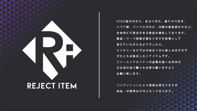 | 商品状態 | 軍放出のUSEDのリジェクト ※こちらはUSED品の中から、目立つ汚れ、破れや穴あき、リペア跡、バックルの欠け、内側の塗装剥がれなどの全体的に不具合のある商品を選別しております。 ※商品の状態についてご指定いただくことは出来ません。 ※ご購入後の返品・交換は一切お受けできません。予めご了承下さい。 |