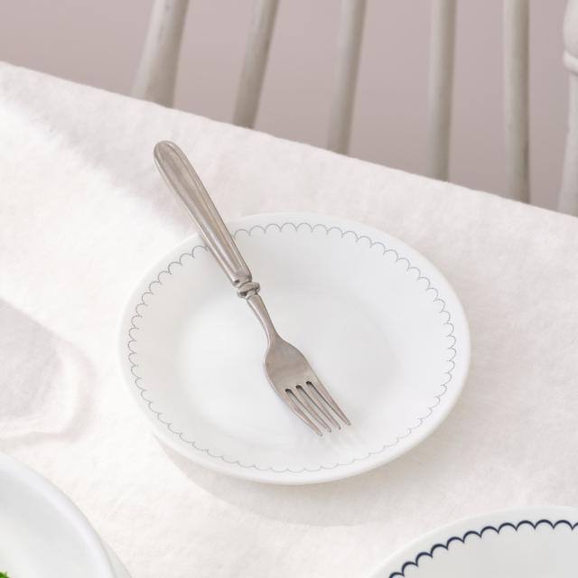 カスピアンレースのデザインはホタテ貝の模様からインスピレーションを得ており、繊細な装飾にフォーカスしながら、波模様をシンプルかつ心地よく表現しています。ネイビーのディテールが入ったすっきりとしたホワイトカラーは、軽やかで快適な肌触りで、毎日のディナーウェアにおすすめです。