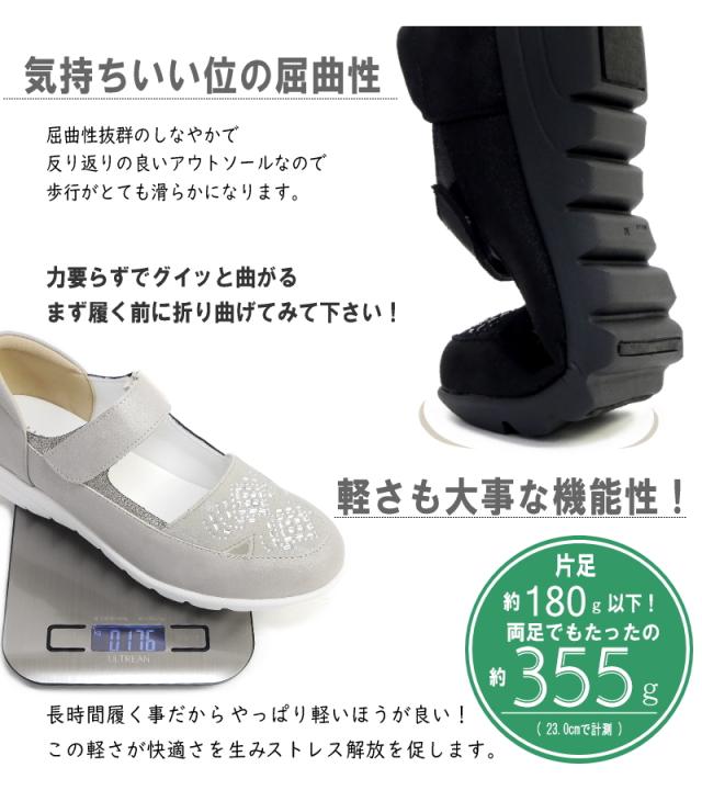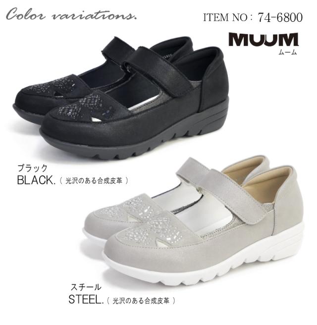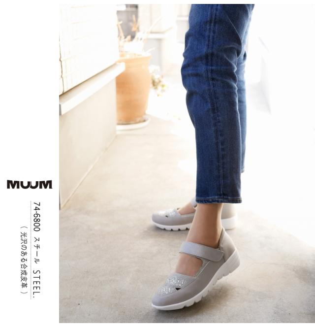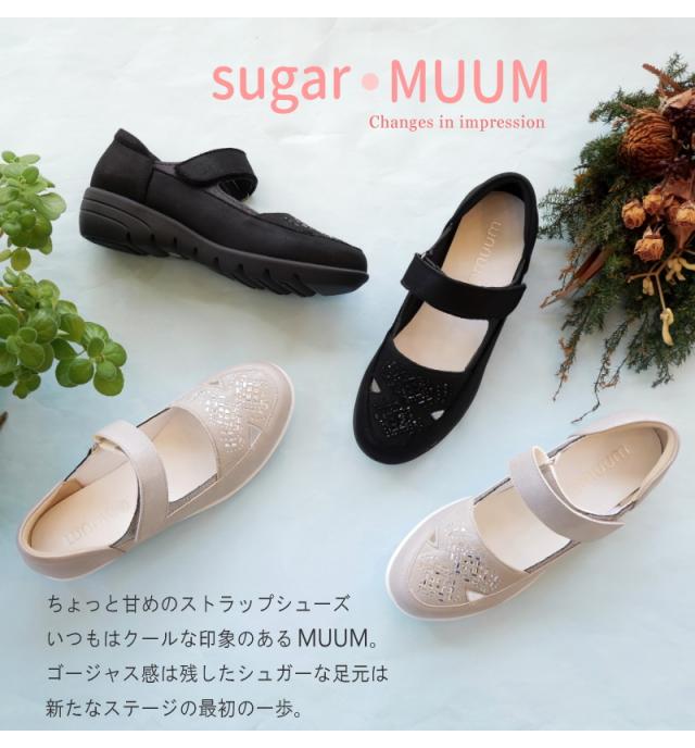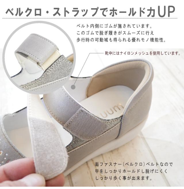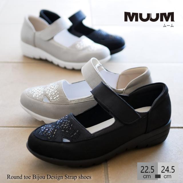 MUUM ムーム ストラップシューズ 靴 レディース クリアストーン ビジュー 面ファスナー ベルクロベルト 軽量 グリップ 滑りにくい ラウンドトゥ 屈曲 3e