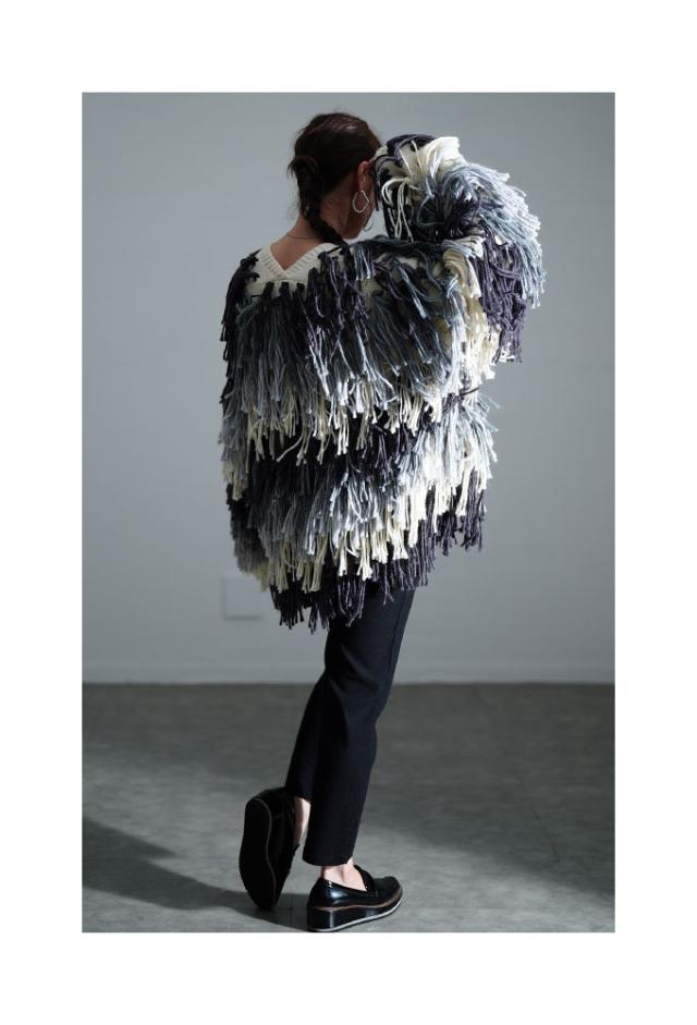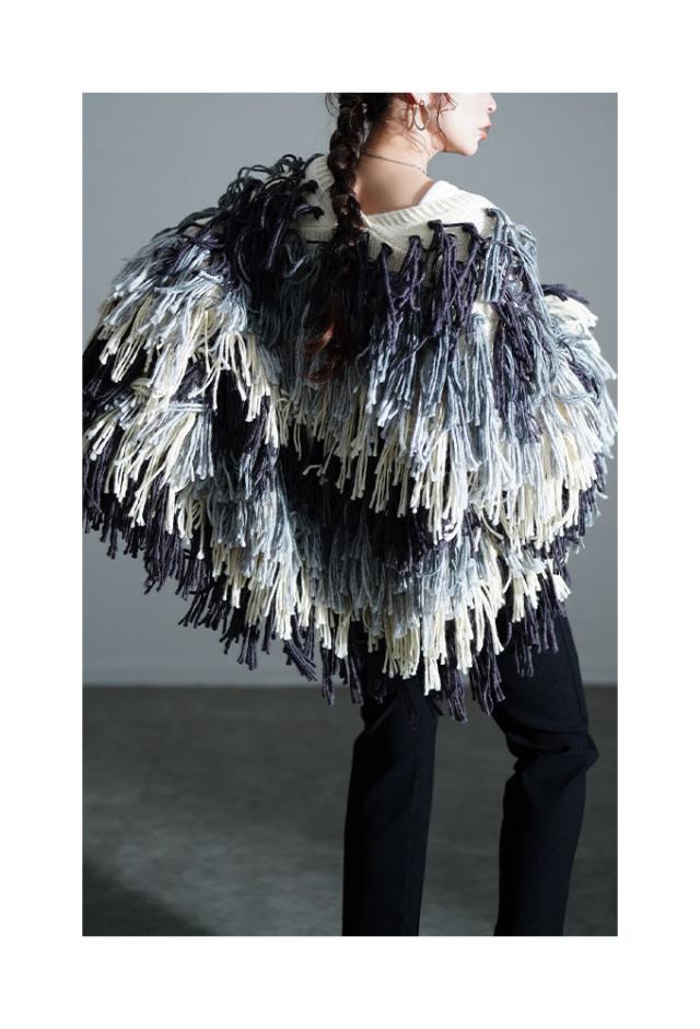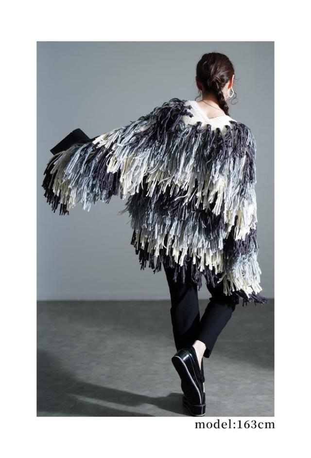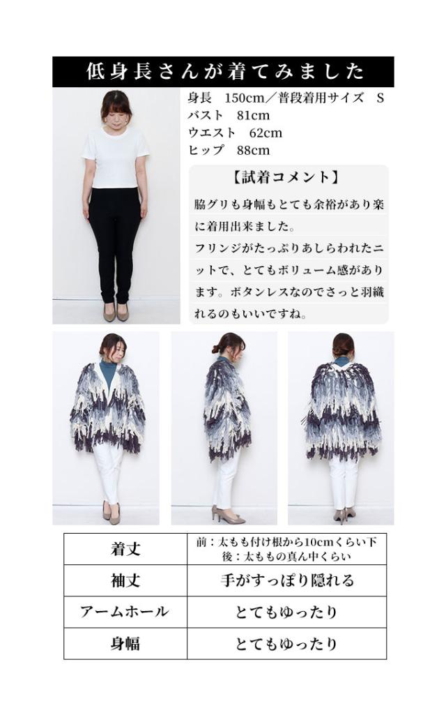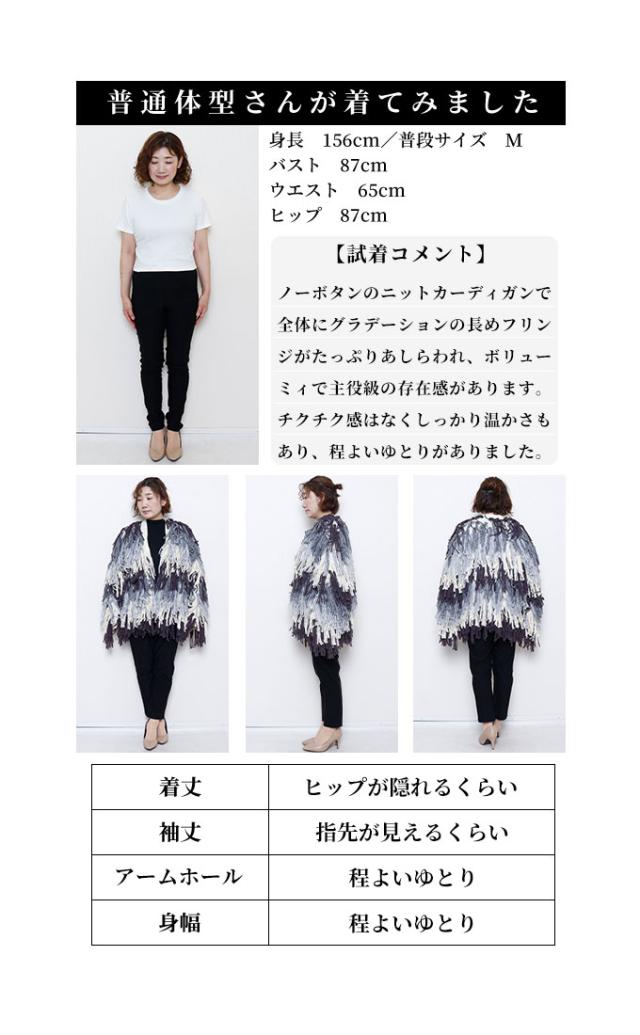 着丈はヒップが隠れるくらい、袖丈は指先がフリンジの間からのぞくくらいです。ノーボタンのニットカーディガンで、全体にグレーグラデーションの長めフリンジがたっぷりあしらわれ、ボリューミィで主役級の存在感があります。チクチク感はなくしっかり温かさもあり、程よいゆとりがありました。