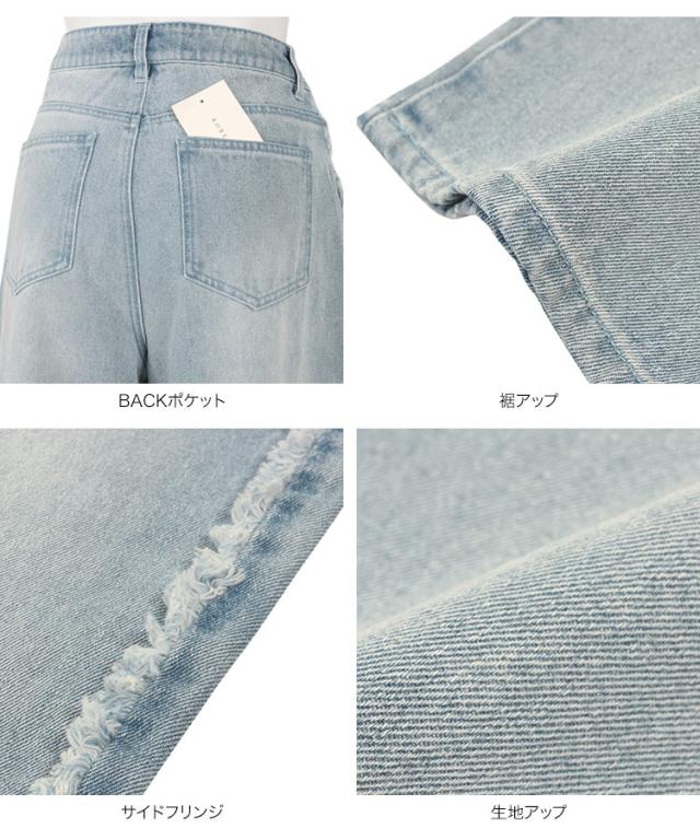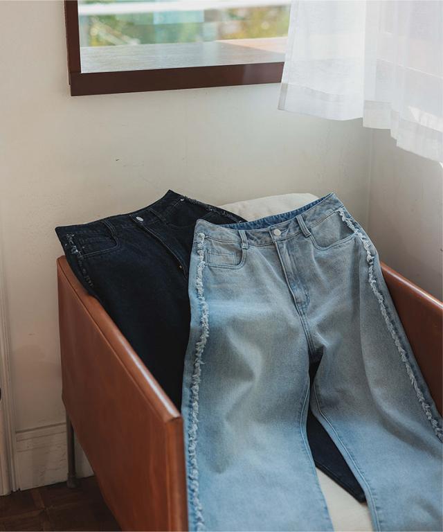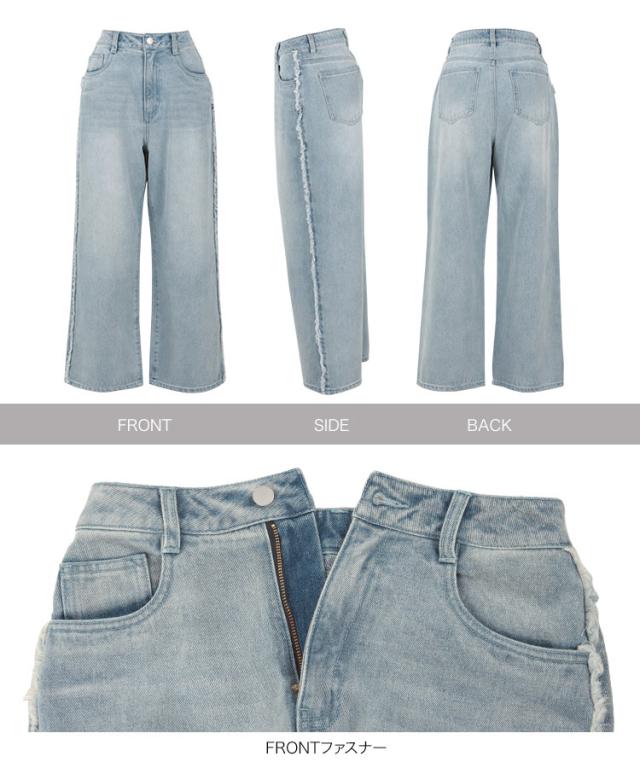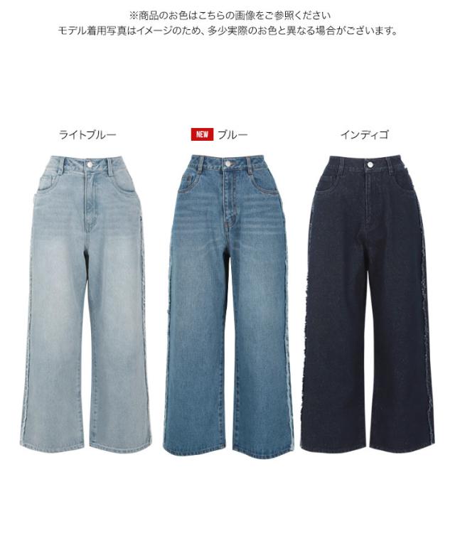 サイドにフリンジラインが施されたデザインで、シンプルながらも個性を引き立てます。リラックス感がありながらも、美しいラインが特徴のワイドストレートのシルエットです。ロングシーズン着用できるので、季節を問わず活躍するアイテムです。【素材・サイズ感】股下サイズは低身長さんが着こなしやすい丈で設定。さらにヒップやウエスト周りは3サイズ展開と豊富なので、お好みや体型に合わせてお選びいただけます◎。カジュアルでありながら女性らしいシルエットを演出してくれるデニムは、どんなコーディネートにも合わせやすく、デイリーユースにぴったりです。※キャンセル/変更不可※※お届けまでの日程について