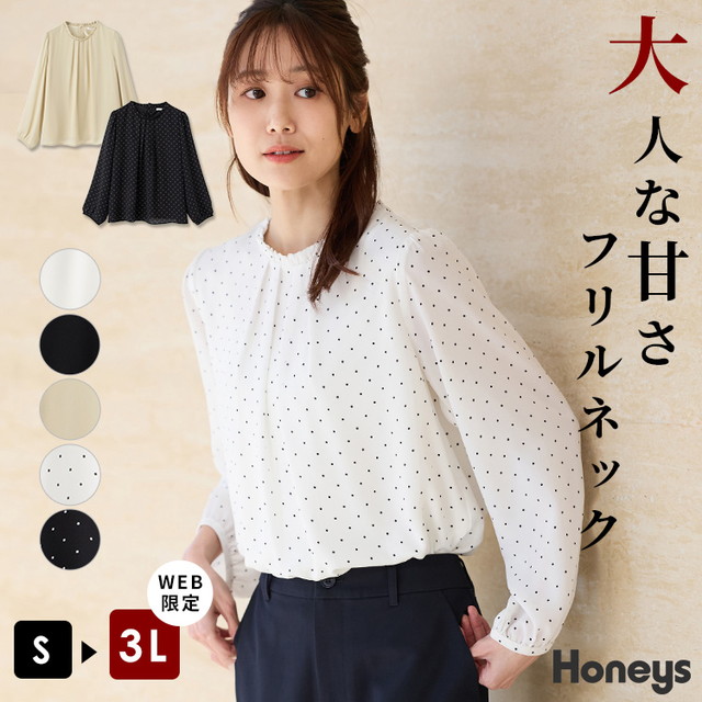 トップス ブラウス 長袖 大きいサイズ オフィス きれいめ 再生ポリエステル ジョーゼット 無地 ドット柄 レディース Honeys ハニーズ フリルネックブラウス
