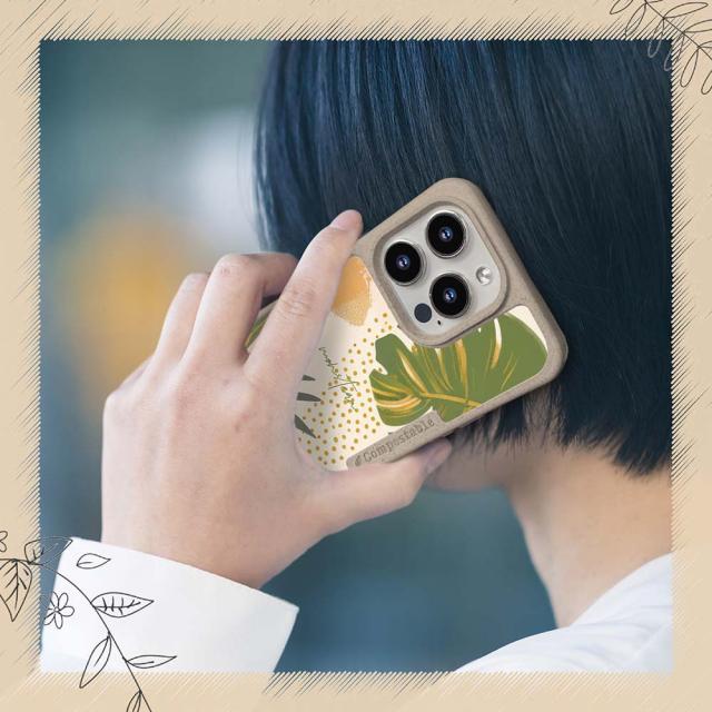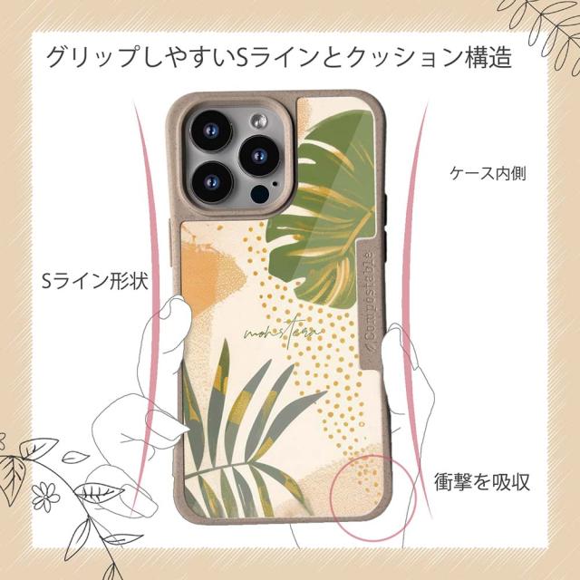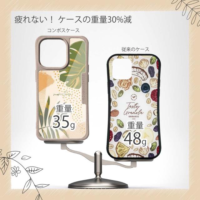 | ケースについて | 背面の内側に入れ込むデザインシートで、シーンに合わせて着せ替え可能。また、グリップしやすいクッション構造で、本体重量は約35gと軽減化を実現。さらに衝撃に強いSライン形状、究極に押しやすいボタン設計(切り込みが入ることで押し込む力を軽減)、背面のカメラ・レンズを保護する高さ設計となっております。生分解性プラスチック素材ながらも着脱もしやすく、割れない・指紋防止加工を施しています。 |