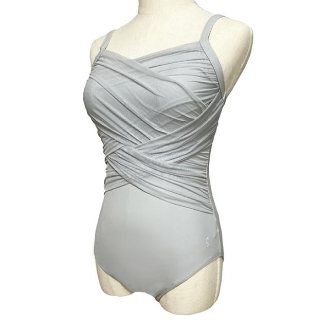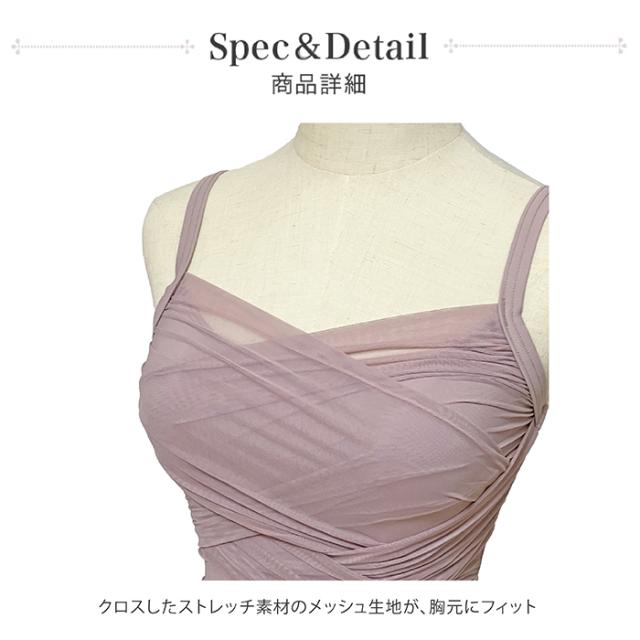 胸元からウエストまでメッシュ素材の生地がクロスされており、ドレープを纏うようなVラインでデコルテを美しく演出します。