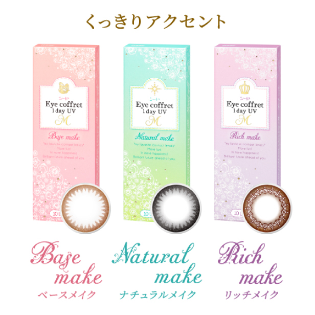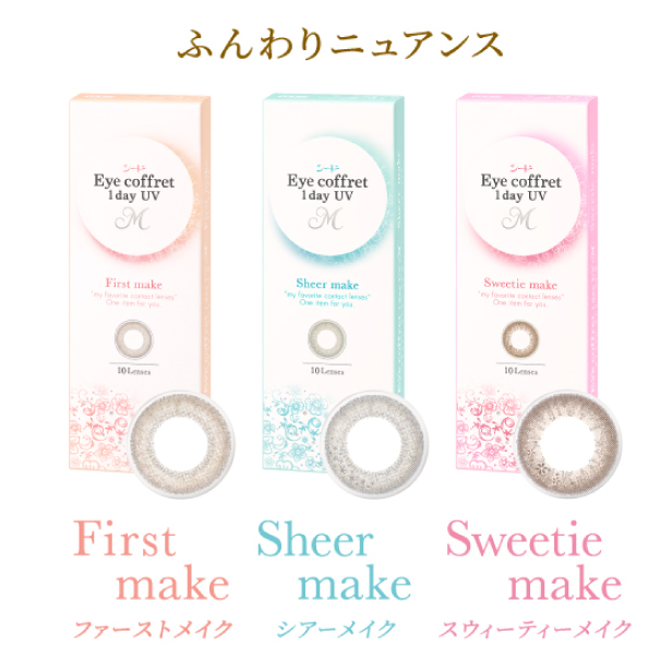 | レンズカラー | 【くっきりアクセント】 リッチメイク ベースメイク ナチュラルメイク 【ふんわりニュアンス】 ファーストメイク※新色 シアーメイク※新色 スウィーティーメイク※新色 |