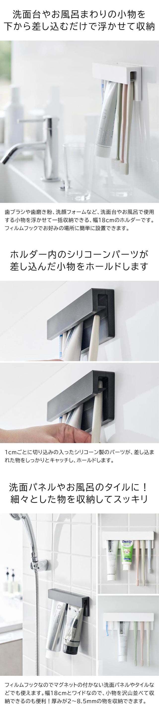 フィルムフックで洗面パネルやタイルに簡単設置!歯ブラシや洗顔フォームなどを、下から差し込むだけで浮かせて収納できる幅18cmのホルダー。浮かせるので乾きも早く、掃除もラクに!