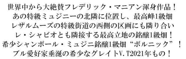 世界中から大絶賛フレデリック・マニアン渾身作品! あの特級ミュジニーの北隣に位置し、最高峰1級畑 レザルムーズの特級街道の西側の区画にも隣り合い レ・シャビオとも隣接する最高立地の銘醸1級畑! 希少シャンボール・ミュジニ銘醸1級畑“ボルニック”! ブル愛好家垂涎の希少なグレイトV.T2021年もの!