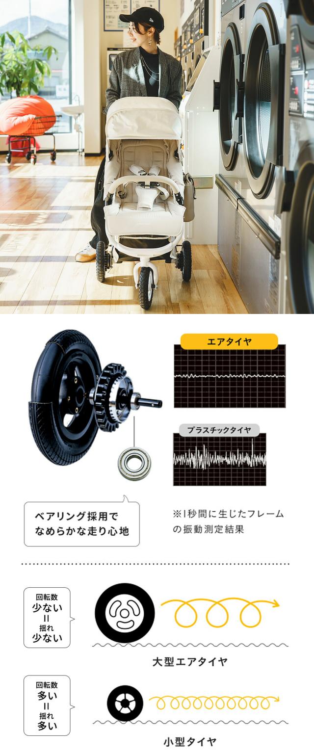 ・エアタイヤが衝撃を吸収するので、首座り前の赤ちゃんの気になる「頭の揺れ」も低減します。