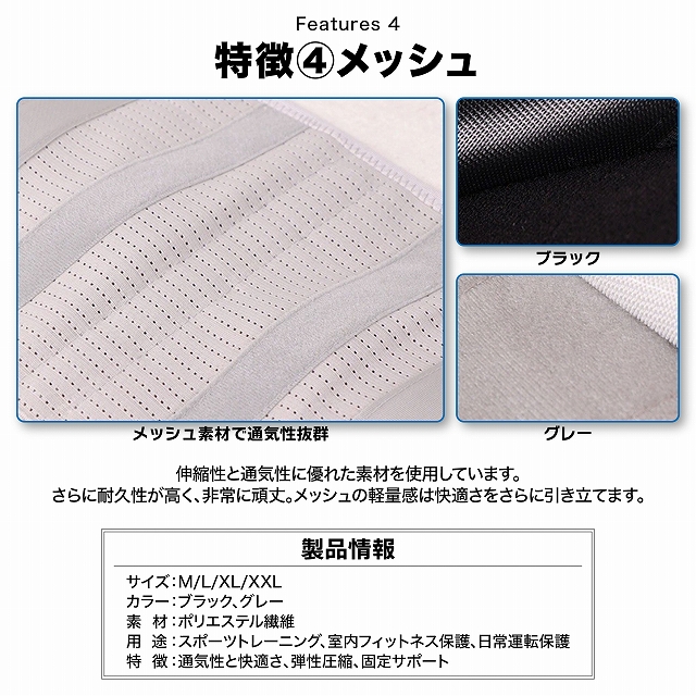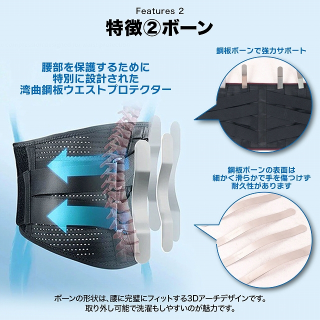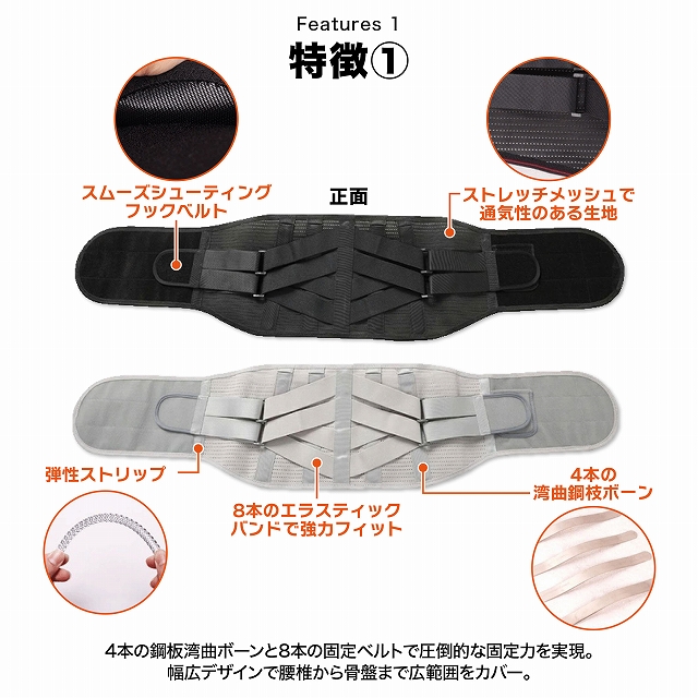 非収縮素材と収縮素材を組み合わせたコンビネーション構造で腰をガッチリ保護。第1腰椎から骨盤まで広範囲をしっかりとサポート。パワーギア構造により、少ない力でしっかり固定が可能。前幅15cmで、前かがみ時に腹部への圧迫感を軽減するデザイン。4本の着脱可能な鋼板湾曲ボーンで腰部を強力固定。鋼板湾曲ボーンは取り外し可能。ハの字型の8本のベルトでウエストと骨盤のサイズ差にもしっかりフィット。全面メッシュゴム使用で通気性と柔軟性抜群。