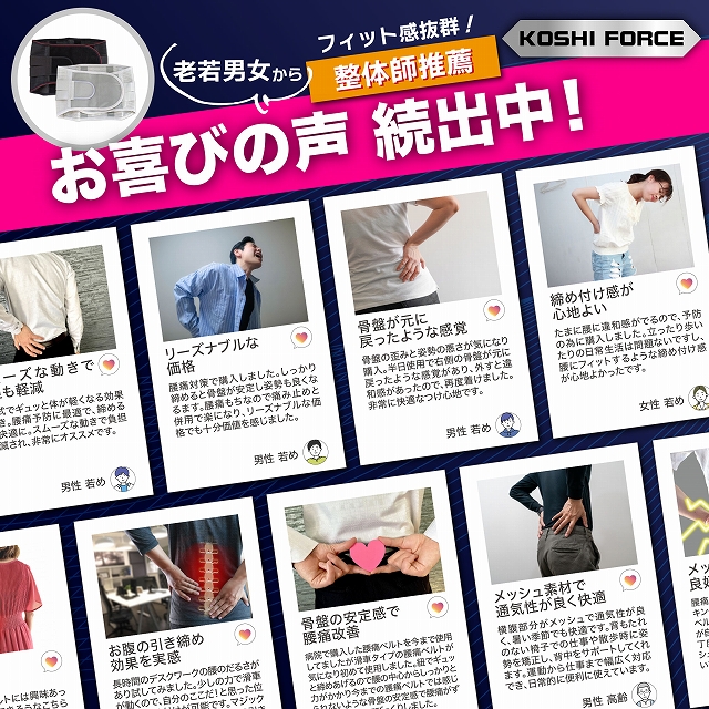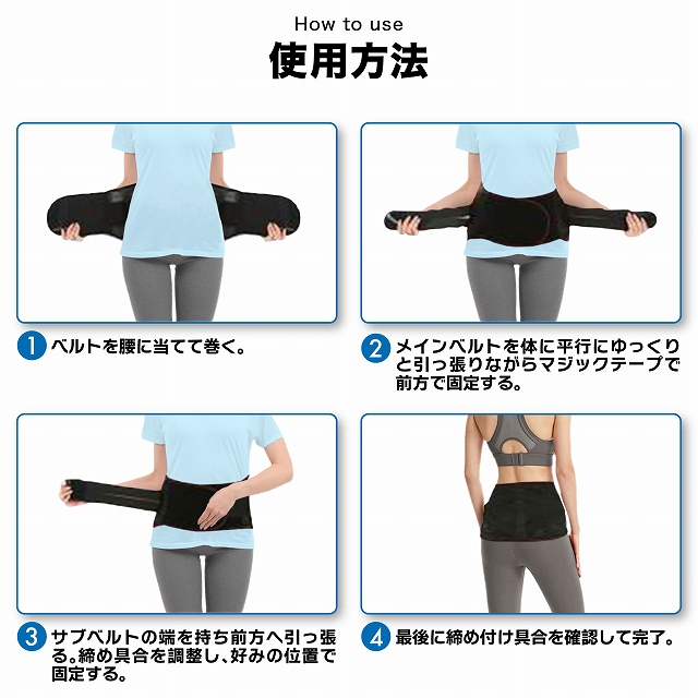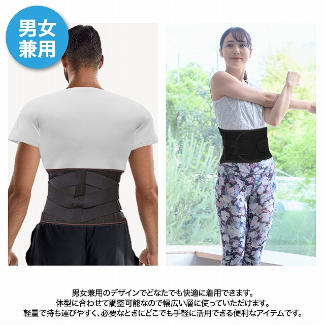 一般に、腰に負担のかかる姿勢がつづくと腰痛などの腰トラブルを引き起こします。本製品はこうした腰トラブルを予防し、腰をしっかりと保護・固定することを目的としています。装着することで腹圧が高まり、結果として腰への負担を大幅に軽減します。万一、ぎっくり腰やヘルニアになってしまった後でも、装着することで痛みを和らげる効果が期待できます。また、長期間の使用によって腰椎をしっかりサポートし、仕事や日常生活に伴う腰、腹部、背中の不快感を軽減する助けとなります。