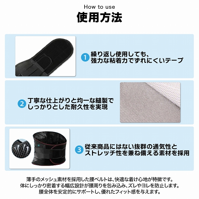 腰をしっかりサポートするためのベルトです。腰全体に巻き付くコルセットタイプ。ぎっくり腰/ヘルニアといった腰トラブルの予防や、負荷のかかる姿勢から腰を保護する用途に最適です。常に腹筋に軽い力を入れた状態を保つことができ、日常生活を快適に過ごせます。伸縮性・通気性に優れたメッシュ素材を採用。ズレにくく、着用したままで簡単に締め付けの加減を調整できるのが魅力です。