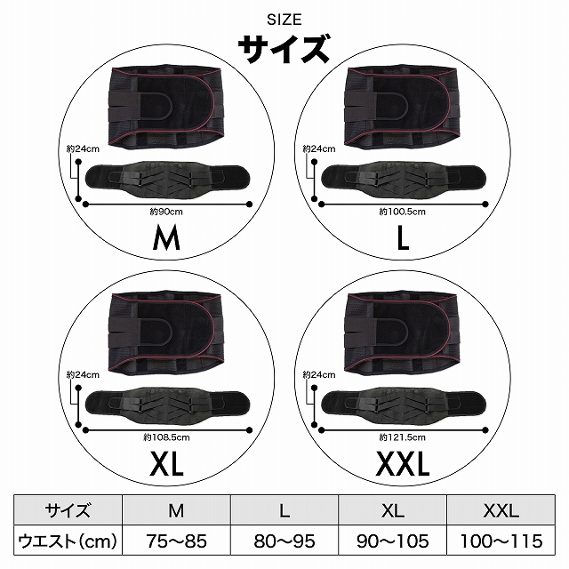 対応ウエストサイズは4種類。2サイズにまたがる方は中央値に近い方がおすすめです。きつく締めたい方は小さい方を、余裕を持ちたい方は大きい方をお選び下さい。