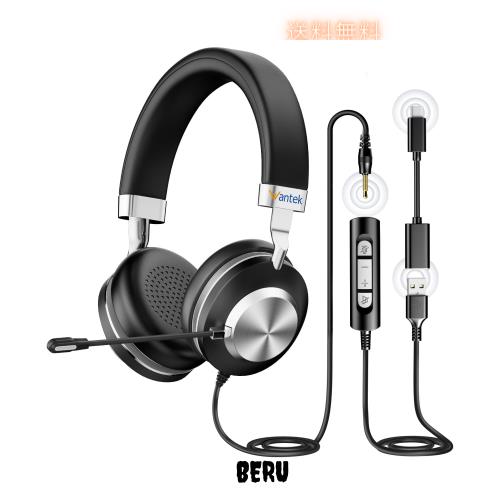 Wantek アップグレードヘッドセット USB Type-C 3.5mm 両耳 新型ノイズキャンセリングマイク付き 有線コントロール PC用ヘッドホン Web会