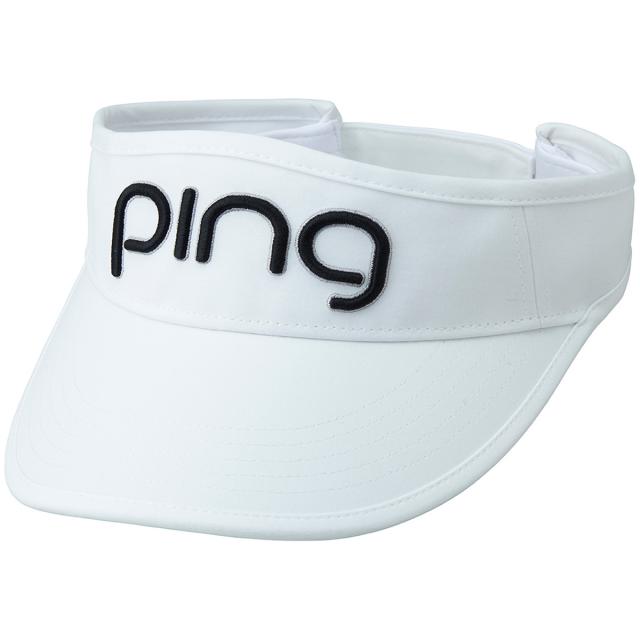 ・キャッチ「レディスツアーモデルサンバイザー」・デザイン「グローバルツアーバイザーに合わせた形状とロゴ使いのモデル。」・ディテール「広めの庇で紫外線対策に優れた形状。サイズ調整:面ファスナー」・素材感「撥水加工が施されたポリエステル素材を使用。」
