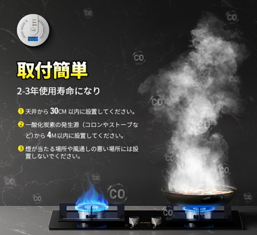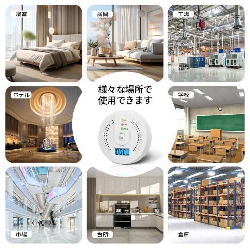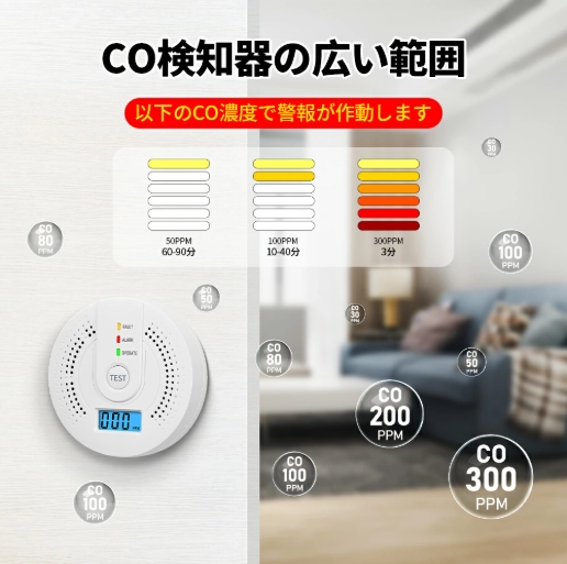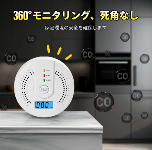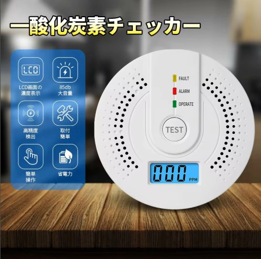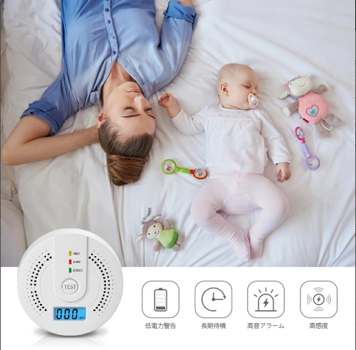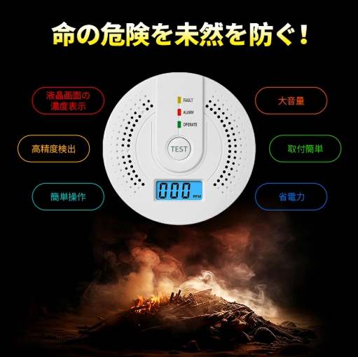 配線不要、家庭用電池式火災警報器、空気中の濃度をデジタル表示、濃度が一定値を超えると音が鳴ります。安全な環境で換気を行い、不完全燃焼の原因を究明して音で知らせ、事故を防止し、ご家族の命を守ります。