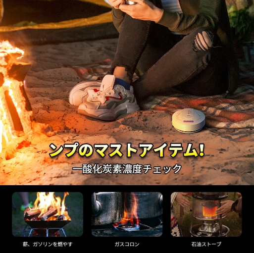 不完全燃焼発生を音によって知らせることで事故を未然に防止! キャンプなどアウトドアシーンで、石油、灯油、ガス、薪、炭などを燃焼させる機器(石油ストーブ、薪ストーブ、ガスストーブ、炭火グリル等)が設置されている場所にご利用ください。