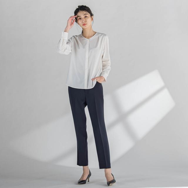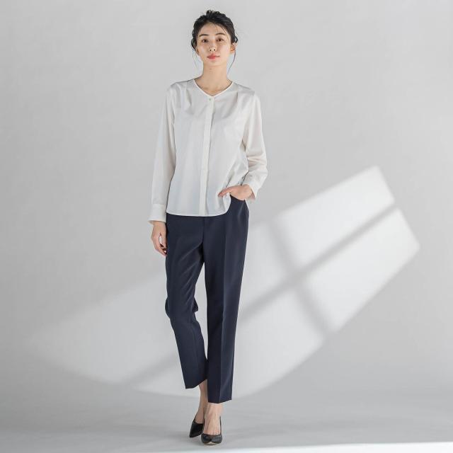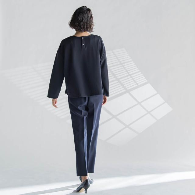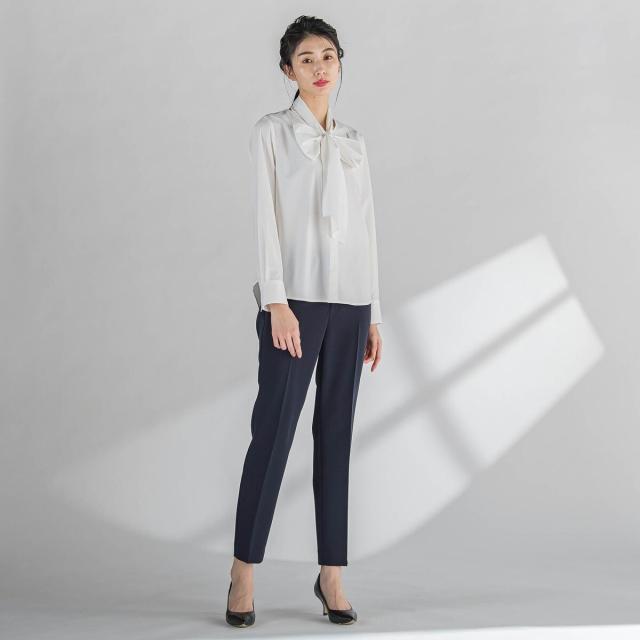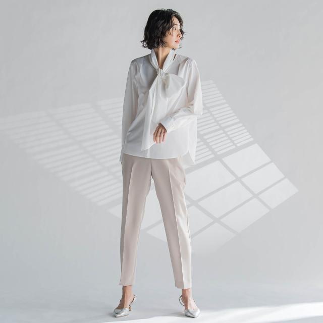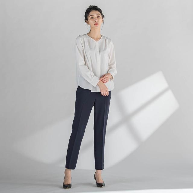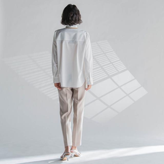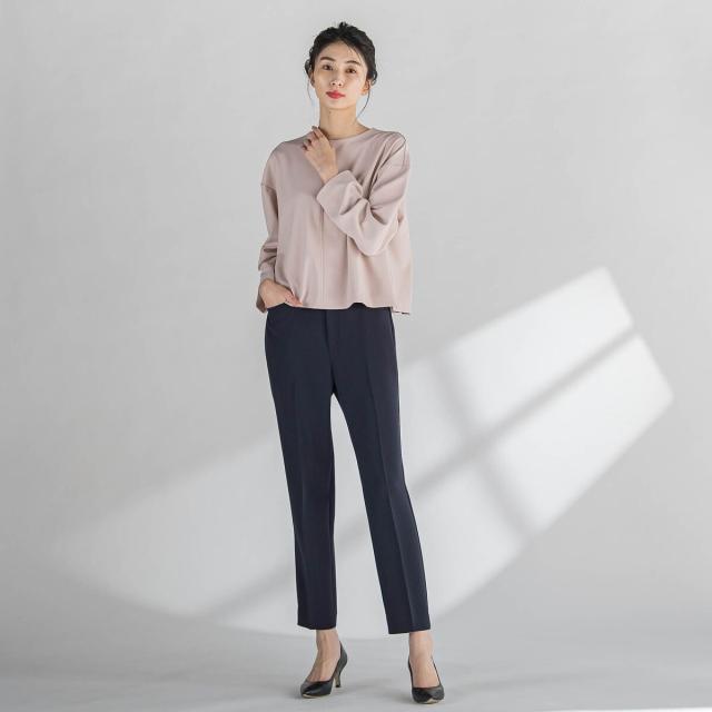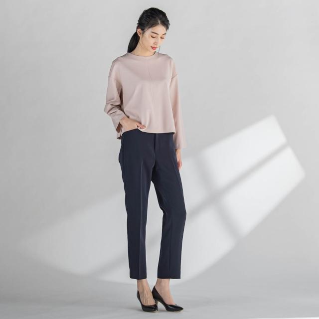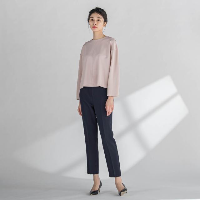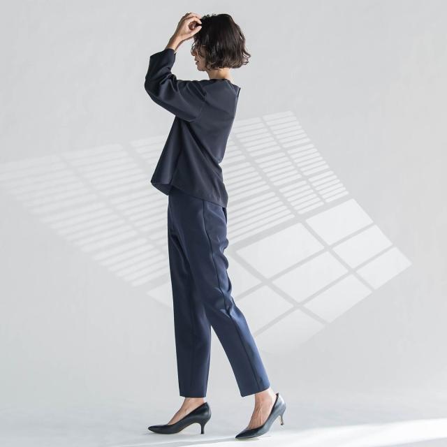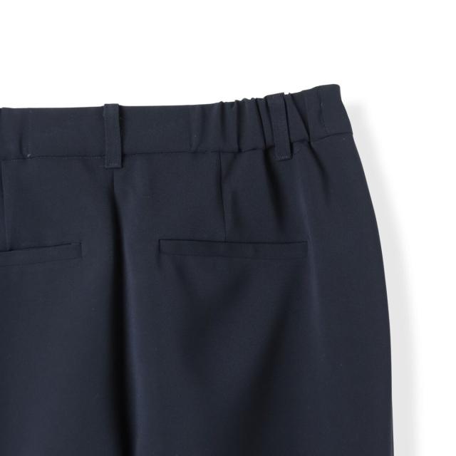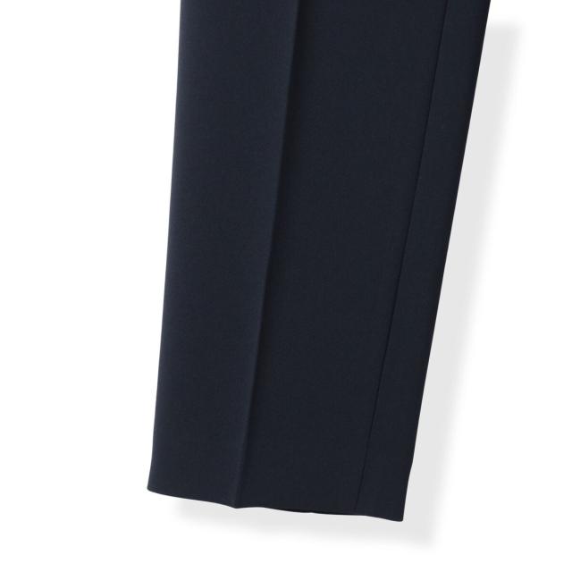 艶やかなトリアセテート混の二重織素材を使用したテーパードパンツ。