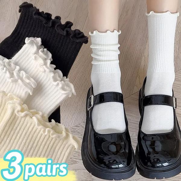 ミッドクルーフリルソックス女性用、女性用アンクルソックス、ハイ通気性ソックス、黒、白、春、秋、3ペア/ロット