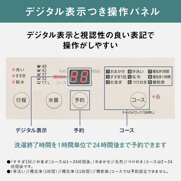 | 商品説明 | ●洗濯・脱水容量:6kg ●標準使用水量:約116L ●目安時間:約42分 ●運転音:洗濯時37dB/脱水時46dB ●コース:おまかせ/すすぎ1回/お急ぎ/手洗い/毛布/つけおき/槽洗浄(1時間)/槽洗浄(11時間)/槽乾燥 ●対応防水フロアー:奥行(内寸)54cm以上 ●付属品:給水ホース、外部排水ホース、保護カバー |