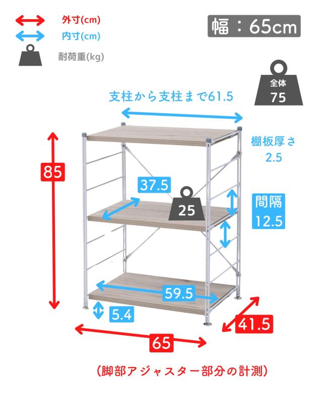| 商品説明 | ●プラスドライバーをご用意ください。 ※重量もあるため、お二人以上での組み立てをおすすめいたします。 ※簡単設置構造のため、横揺れします。耐荷重には影響ございませんが、ご利用時に気になる場合は、『コの字補強バー』もご利用ください。 ※本体外寸の「幅」は、足元のアジャスターの外側〜外側の寸法になります。 ※2022年2月2日より、新色Aホワイトが追加されました。 ●モノに合わせて棚の位置を変えられる木製棚板のスチールラック ●インボックスなど収納ボックスが縦にすっぽり収まるサイズ設計 ●棚板は木の質感があってお手入れもかんたんな、合成樹脂化粧繊維板 ●軽くて強いフラッシュ構造で、1段あたり25kgの耐荷重 ●フックでフレームに引っ掛けるだけなので、位置の変更もかんたん ●棚板を追加したり複数揃えると、フラットに横連結可能 ●脚部には、ガタつきを抑えるアジャスター付き ●耐荷重: 1段あたり25kg、全体75kg ●可動式棚板3枚(板の厚さ2.5cm、約12.5cm間隔、7段階高さ調節) ●(最下段時)棚板下5.4cm ●棚板サイズ:幅59.5 奥行き37.5cm ▼別売りパーツの取り扱いを2022年1月より開始しました ・キャスターセット(ストッパー付き2個、ストッパーなし2個) ・追加棚板 ・コの字補強バー ・帆立(側フレーム、片側ずつ) ・クロスバー ●専用キャスター装着時耐荷重: 1段あたり25kg 全体100kg ●専用キャスター装着時: 本体高さ89cm ▼2025年1月より以下のパーツが追加となります。 ・2段引き出し ・スライド棚 ・ストッカー+コの字バー |