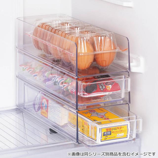 スキットシリーズ別売りの冷蔵室トレー(スリム・浅型)と組み合わせると引き出しのように使えます。スタッキングすればスペースの有効活用ができ、よりスッキリと使いやすく収納ができます。