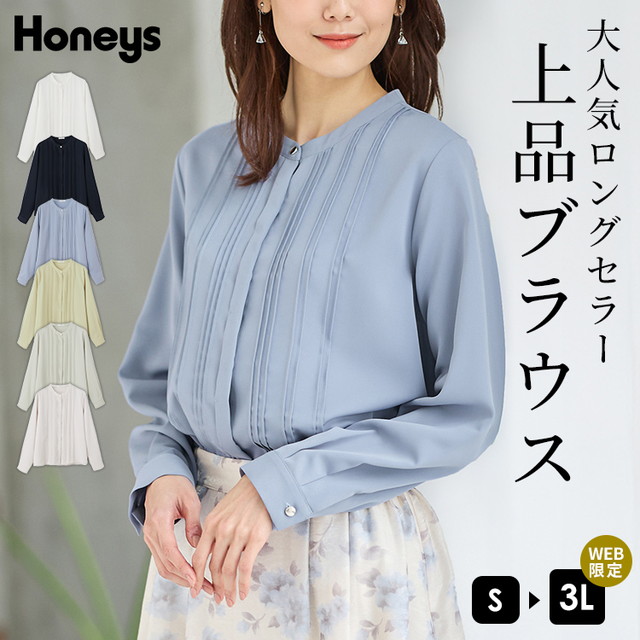 トップス ブラウス 長袖 大きいサイズ オフィス きれいめ ピンタック 再生ポリエステル 変わり織り 無地 レディース Honeys ハニーズ ピンタックブラウス