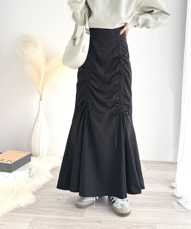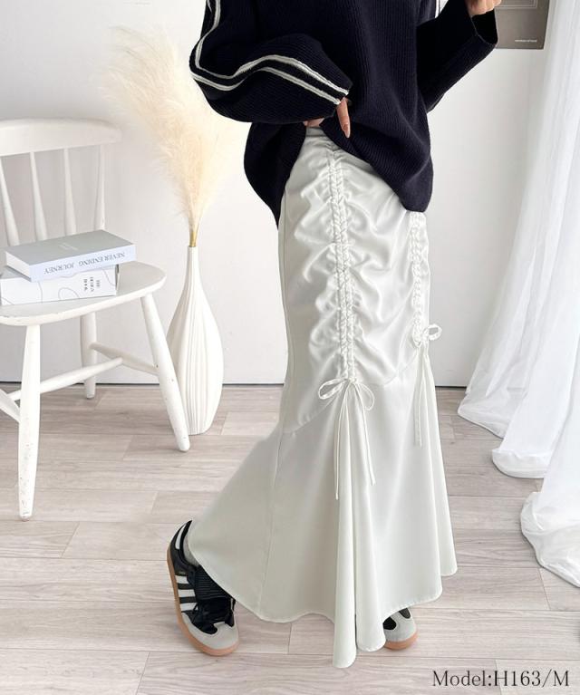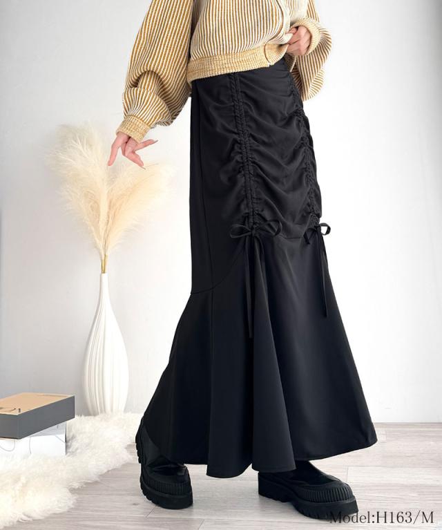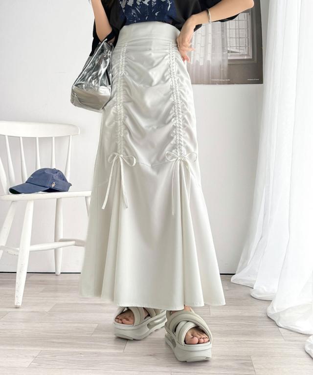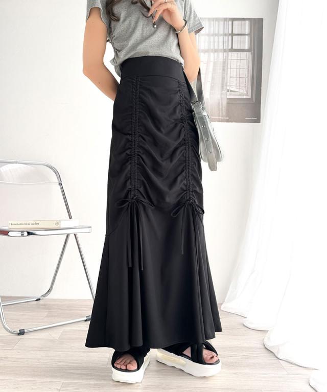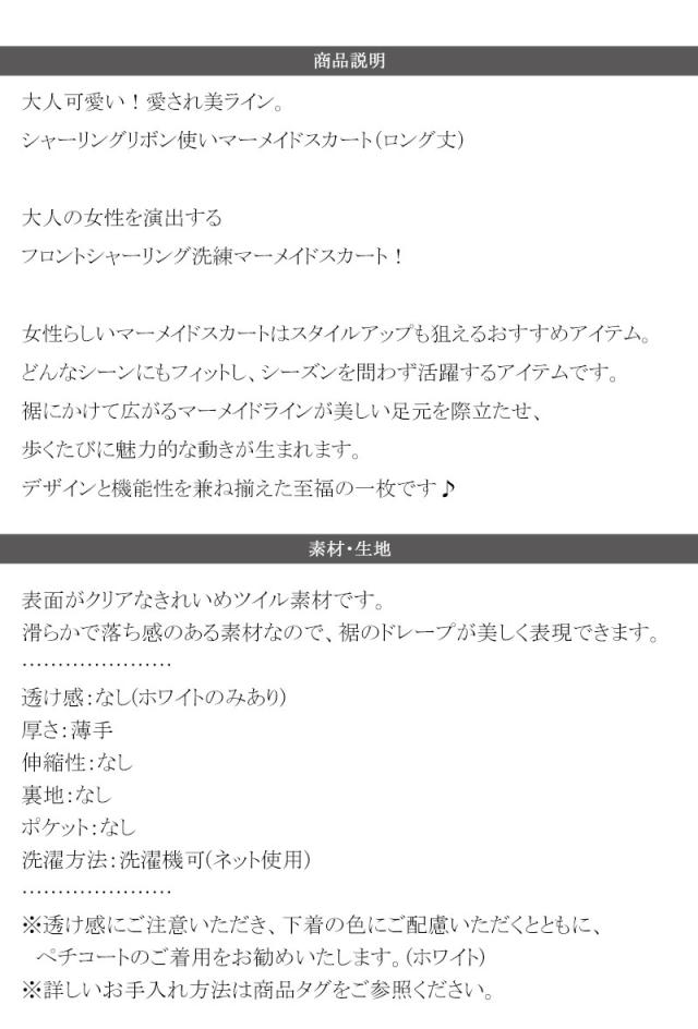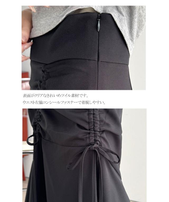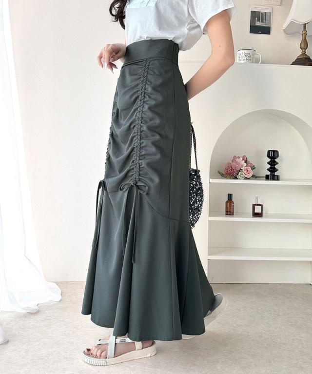 クラシカルエルフ春新作 ボトムス スカート レディース フロント シャーリング リボン 使い マーメイドスカート (ロング丈)ウエスト サイド ファスナー 愛され 美ライン スタイルアップ 大きいサイズ 2026ss ce0940215