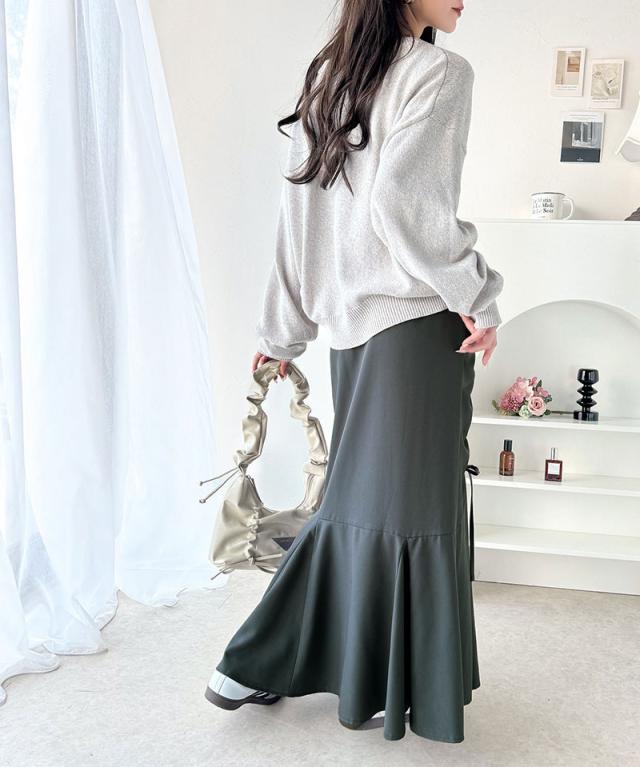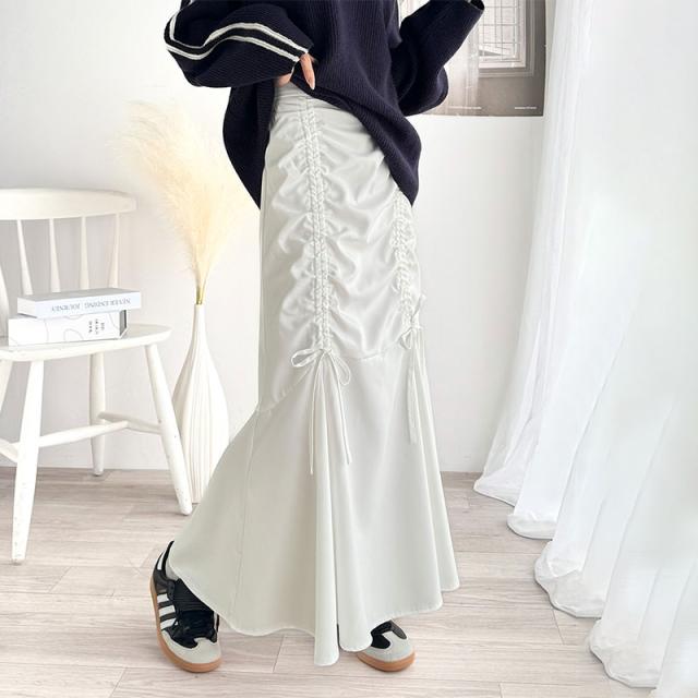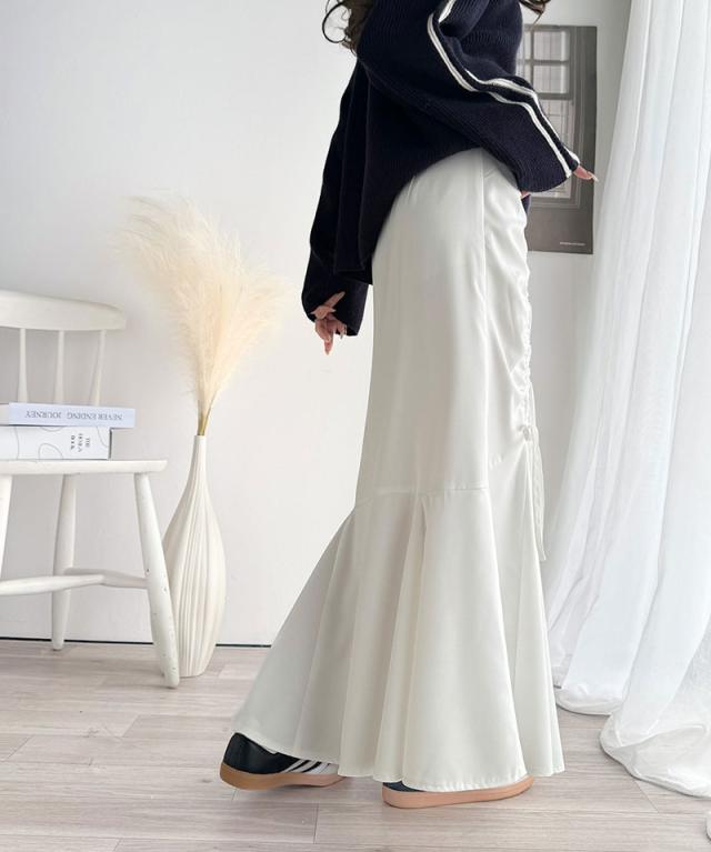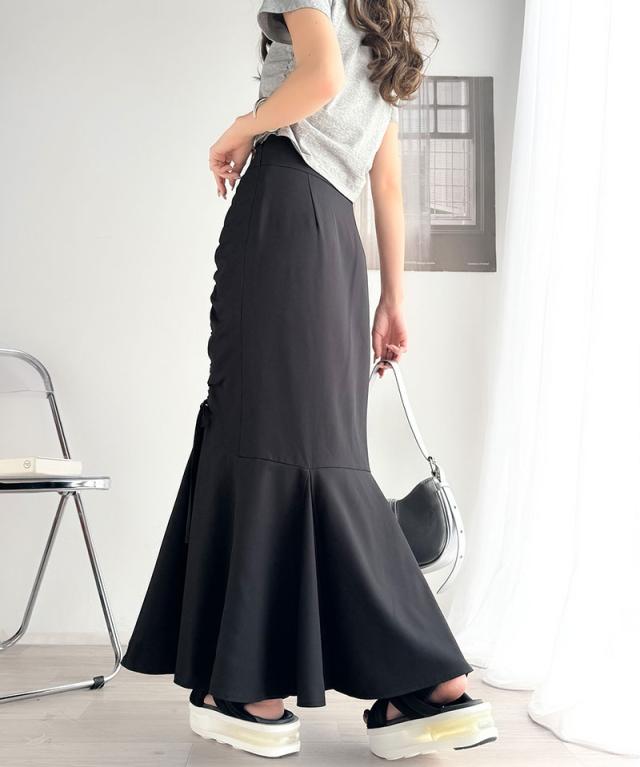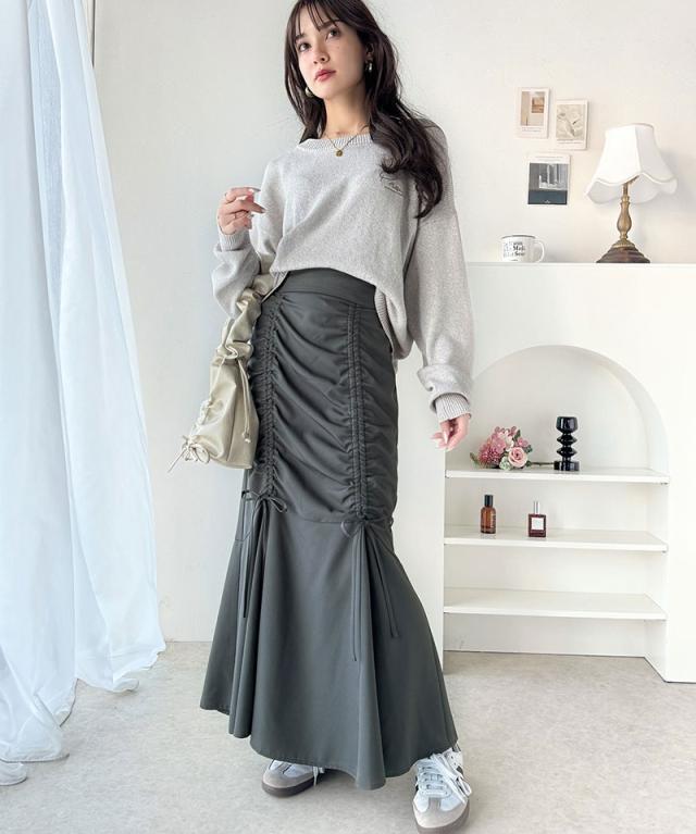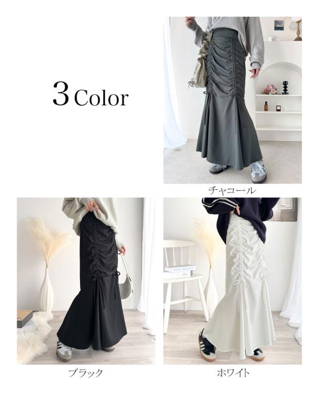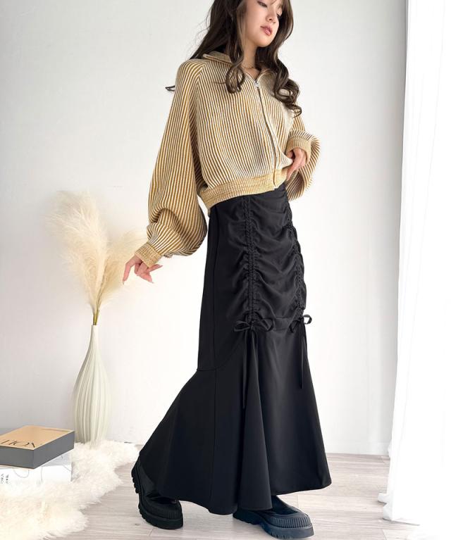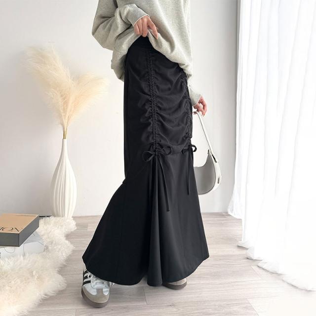 クラシカルエルフ春新作 ボトムス スカート レディース フロント シャーリング リボン 使い マーメイドスカート (ロング丈)ウエスト サイド ファスナー 愛され 美ライン スタイルアップ 大きいサイズ 2026ss ce0940215