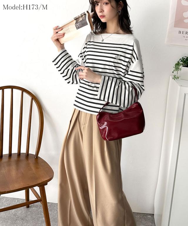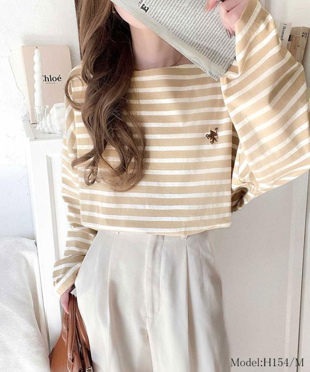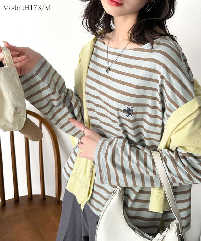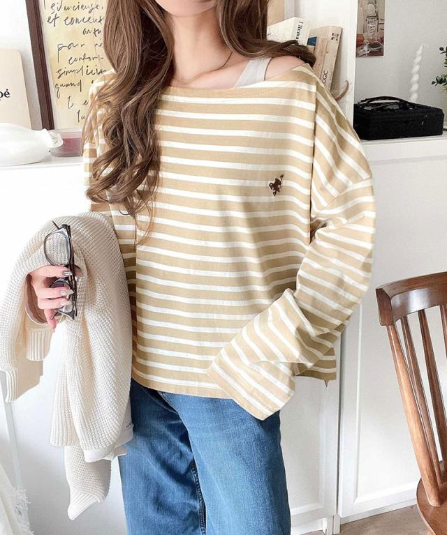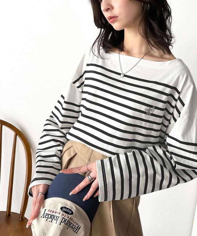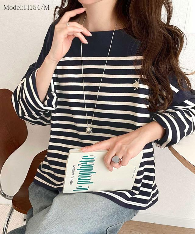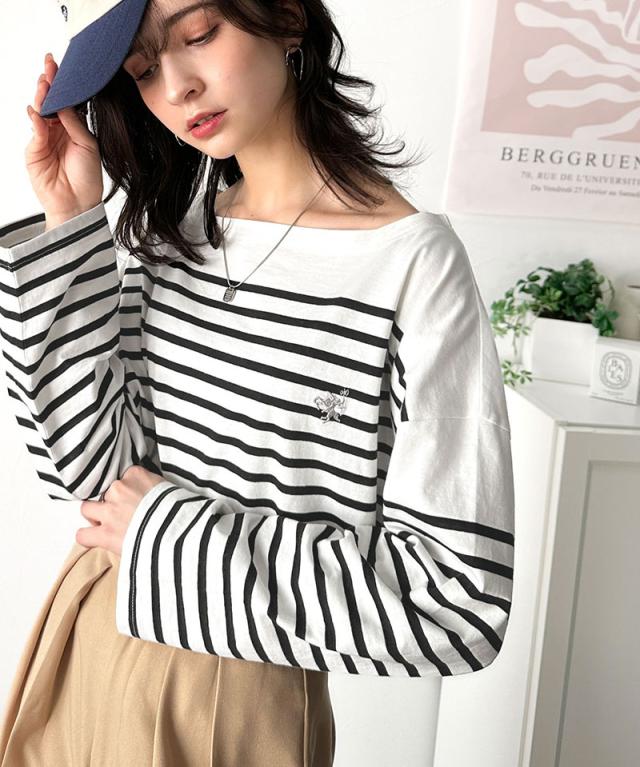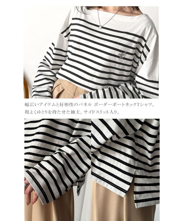 ★快適な着心地と洗練されたデザインが魅力。ボートネックオーガニックコットン100%パネルボーダーTシャツ(長袖)★