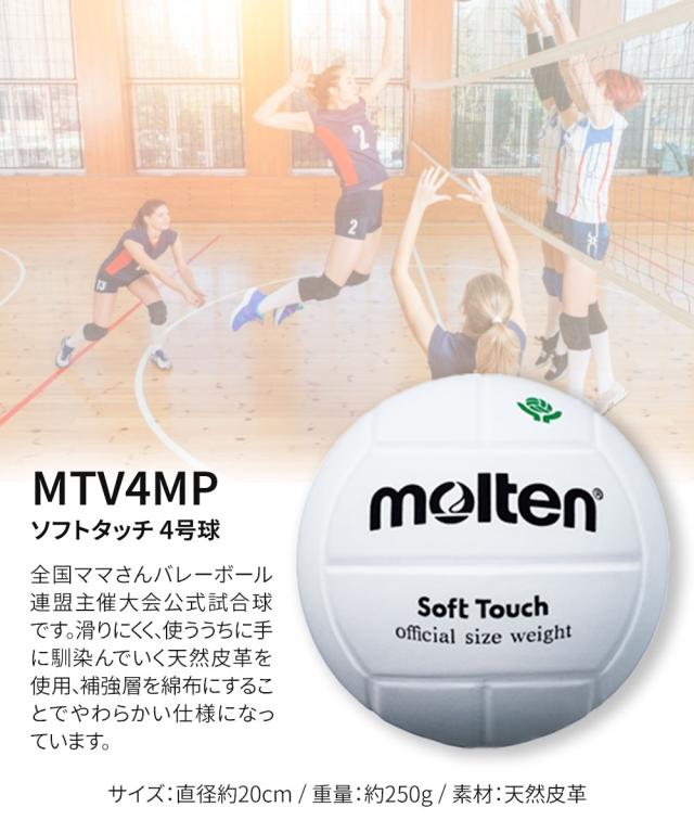 モルテン molten バレーボール 4号 ソフトタッチ 4号球 ママさんバレー 女子バレー レディース キッズ ジュニア 部活 クラブ チーム 練習 自主練 全国ママさんバレーボール連盟主催大会公式試合球 本革 天然皮革 補強層綿布仕様 ボール 球 白 ホワイト MTV4MP