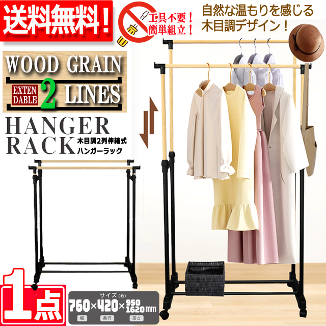 木目調2列伸縮式ハンガーラック