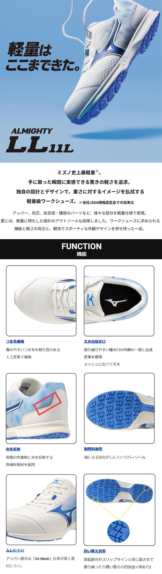 安全靴 ミズノ 新作 MIZUNO ALMIGHTY LL 11L 新商品 紐靴 JSAA規格 2025年 スニーカー メンズ レディース 軽量 樹脂先芯 おしゃれ かっこいい 疲れにくい スニーカー 22.5~29.0cm