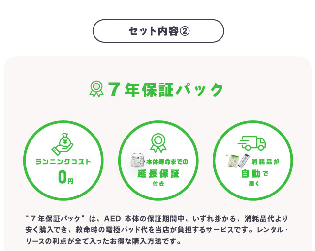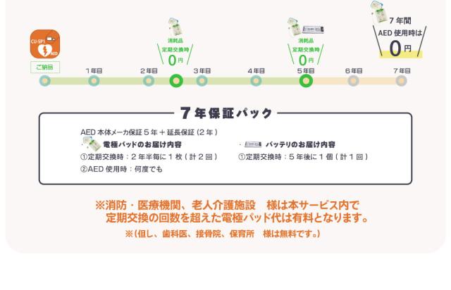 “7年保証パック”は、AED本体の保証期間中、いずれ掛かる、消耗品代より安く購入できさらに、 救命時の電極パッド代を当店が負担するサービスです。(AED本体:弊社延長保証2年付)