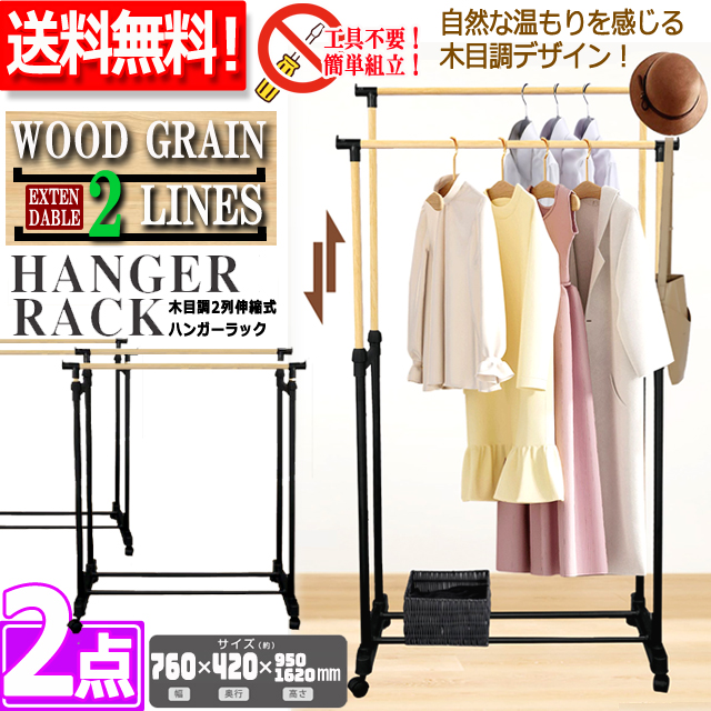 2点 工具不要 簡単組立式 モダン シンプル 新生活 ラック 収納 室内干し (木目調2列伸縮式ハンガーラック 2点) スリム クローゼット 服